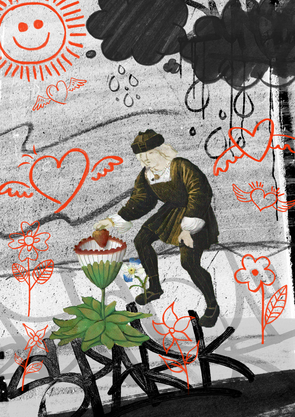 Дубинки врезаются в плечо и лицо. На шее, в подмышках и паху видны округлые, синеватые опухоли — признаки воспаленных желез, указывающие на заражение чумой. Голени и стопы покрыты рваными ранами и царапинами от шипов. Человека преследуют яростные животные: собака, змея и скорпион кусают его за лодыжки, пчела жалит локоть, а внутри живота беспокойно шевелится жаба, вызывая мучения. И все же, несмотря на этот страшный набор ран и язв, Человек-Рана продолжает жить.
