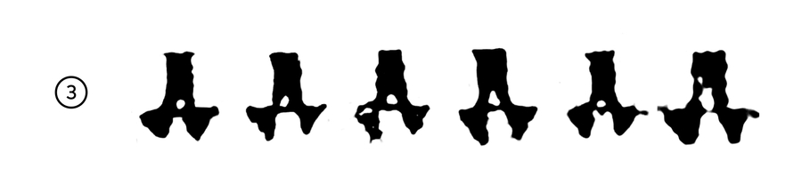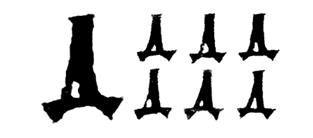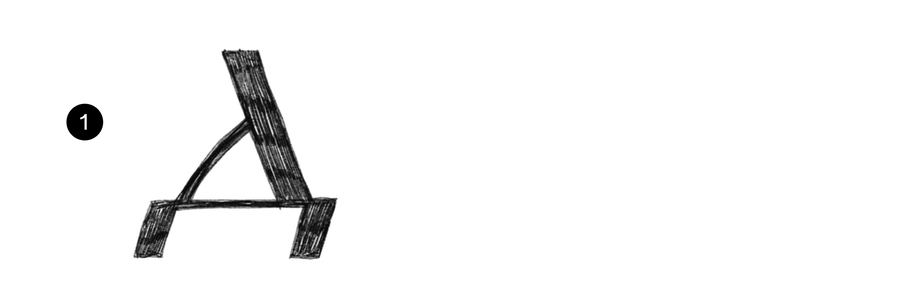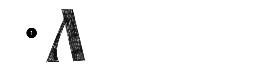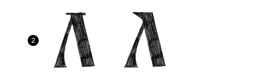 Л повторяет форму А, элементы знака строятся по одинаковым принципам: 1. Апекс (место соеднинения основного штриха и дополнительного). Заканчивается засечкой, клиновидным элементом или выносом основного штриха 2. Угол наклона основного штриха относительно базовой линии 3. Угол присоединения дополнительного штриха к основному (вместе с углом наклона основного штриха определяют широту знака)