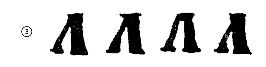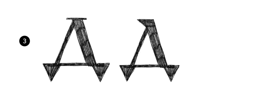3. Статичная треугольная форма с треугольными нижними выносными элементами и засечкой или клиновидным элементом в начале основного штриха