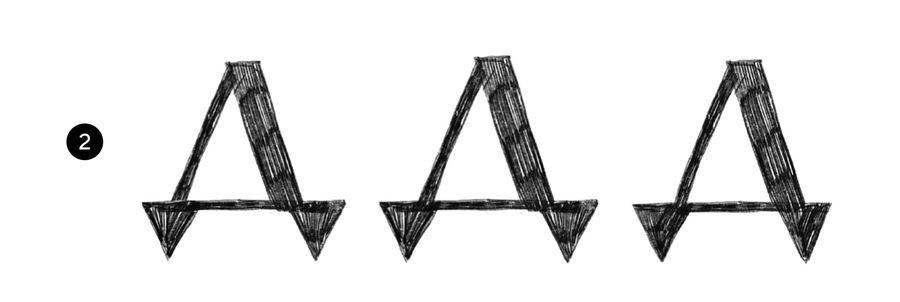 Острая симметричная форма, стремящаяся к равнобедренному треугольнику с засечками в начале и конце основного штриха.