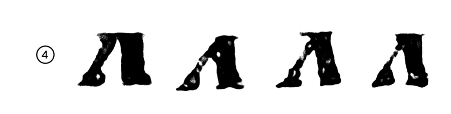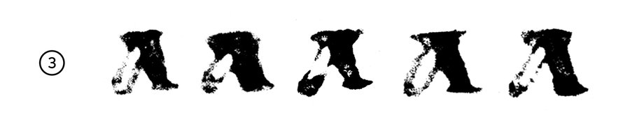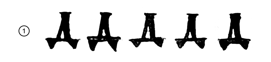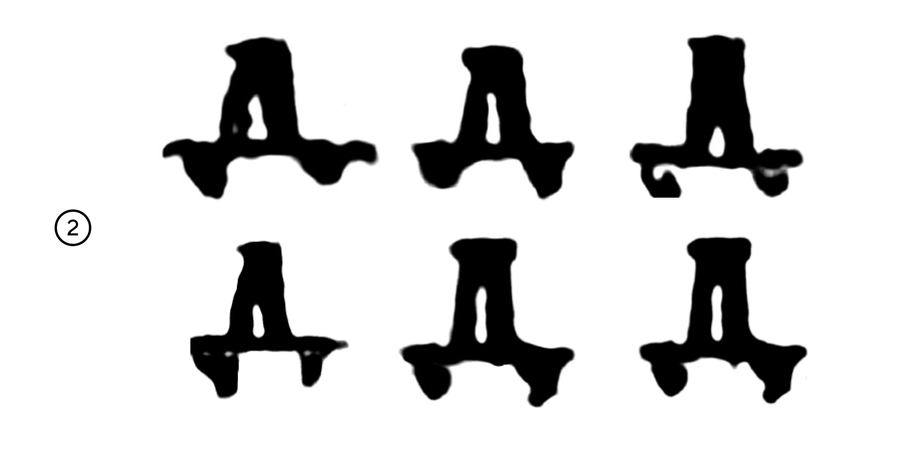 1. Динамическая форма с крючковидными окончаниями основного штриха (односторонними засечками) 2. Статичная треугольная форма с треугольной формой полуовала. Есть вариации с засечкой 3. Статичная треугольная форма со скругленным полуовалом 4. Форма геометрических почерков позднего устава со специфической формой полуовала. Есть вариативность в наклоне основного штриха: от наклоненного влево до вертикального