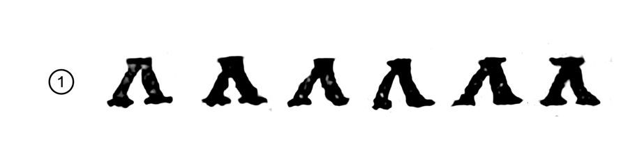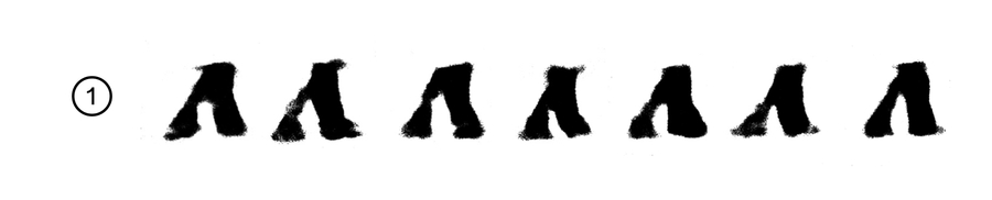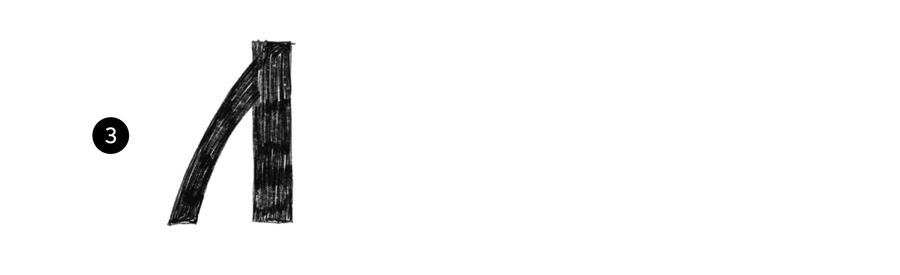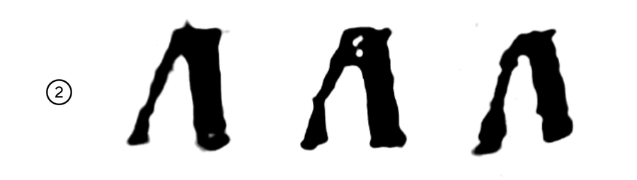 Схема написания буквы из Остромирова Евангелия. Симметричная форма с острым полуовалом и засечкой только в начале основного штриха