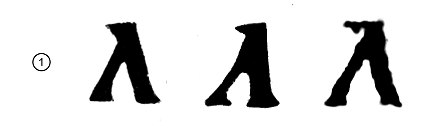 1. Новгородские листки, XI, ОР F.п.I.58 2. Житие св. Кондрата, XI, Погод. 64 Тупое прямоугольное место соединения дополнительного и основного штрихов