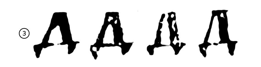 Буква А имела маленькую треугольную головку, а спинку наклонную влево. Надпись Самуила, Саввина книга, а иногда и Супрасльская рукопись имеют эту черту. Русские датированные рукописи XI в. этой черты не имеют — вероятно, потому, что относятся все ко второй половине XI в. В югославянских рукописях такое а встречается и позднее XI в.