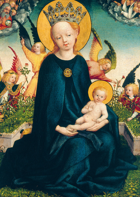 Штефан Лохнер. Мария с Младенцем Христом перед скамейкой из дерна. Ок. 1440. Дерево, масло. Старая Пинакотека, Мюнхен