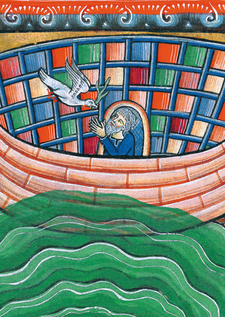 Голубь возвращается к Ною с оливковой ветвью. Мюнхенская псалтирь (Оксфорд). Первая четверть XIII в. Пергамен. Баварская государственная библиотека, Мюнхен