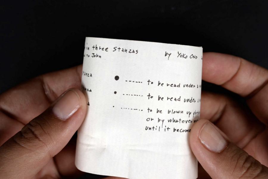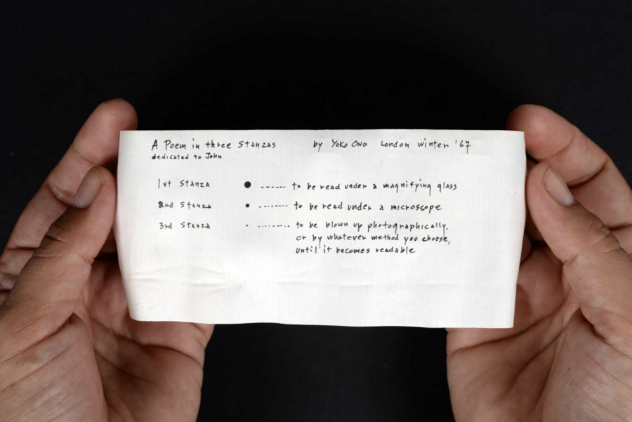 Забавно, например, как работа Йоко Оно из 5-го номера SMS стала проекцией для любовного романа с Ленноном. «Mend Piece» состояла из осколков кофейной чашки, тюбика суперклея и инструкции, как разбить, а затем починить чашку. Когда Леннон был ещё женат на Синтии, Оно отправила звезде «Битлз» загадочный подарок: разбитую чашку и инструкцию по её починке. Вскоре после выхода 5-го номера S.M.S. они стали парой.