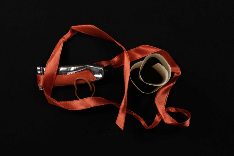 «Mend Piece» Йоко Оно, 1968 Пластиковый пакет, лента, тюбик клея, кусочки бумаги, картонная коробка, в целом (футляр) (15,9 см x 15,2 см x 0,6 см)