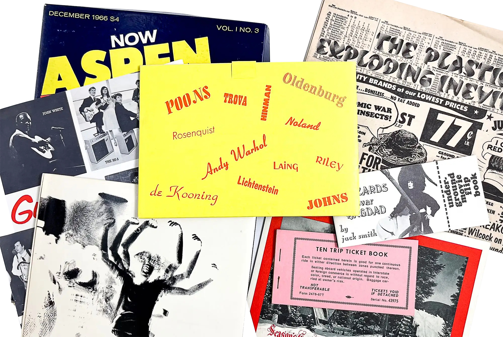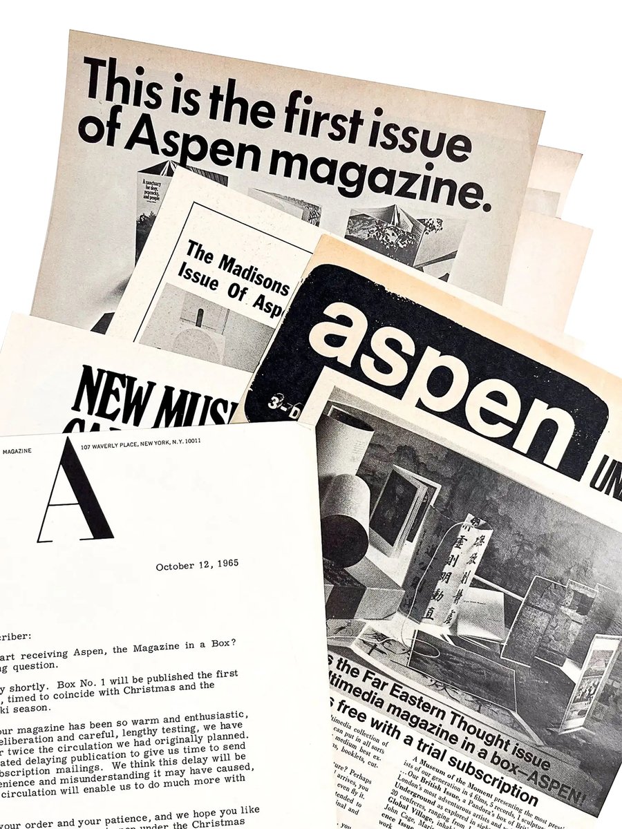 Замысловатый и богато украшенный, Aspen выходил во второй половине 1960-х годов и за 10 выпусков собрал впечатляющий список писателей, художников и музыкантов, которые когда-либо появлялись в журналах того времени: Дж. Г. Баллард (отрывок из «Автокатастрофы»), Ролан Барт («Смерть автора»), Сэмюэл Беккет, Уильям Берроуз, Джон Кейдж, Джон Кейл, Мерс Каннингем, Виллем де Кунинг, Марсель Дюшан, Аллен Гинзберг, Филип Гласс, Дэн Грэм, Эл Хансен, Дэвид Хокни, Джаспер Джонс, Джон Леннон, Сол Левитт, Рой Лихтенштейн, Джордж Мачунас, Ангус Маклайз, Маршалл Маклюэн, Йонас Мекас, Шарлотта Мурман, Йоко Оно, Нам Джун Пайк, Роберт Раушенберг, Лу Рид, Эд Руша, Ричард Серра, Сьюзан Сонтаг, The Velvet Underground, Энди Уорхол и Ла Монте Янг — и это лишь некоторые из них.