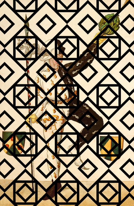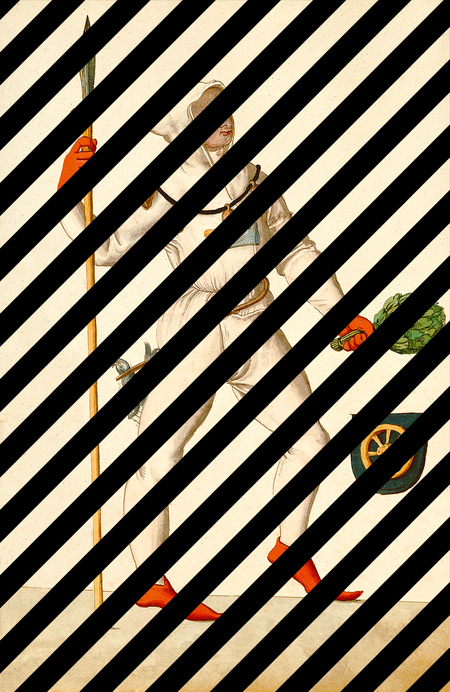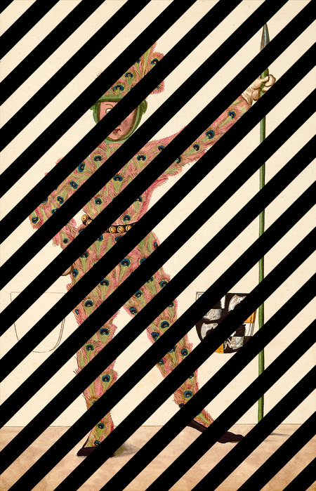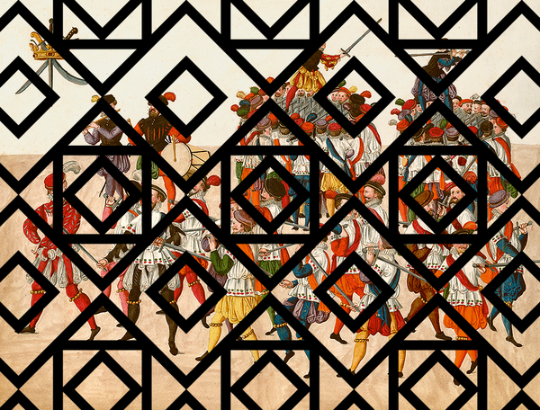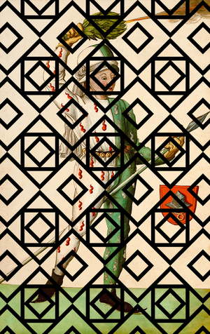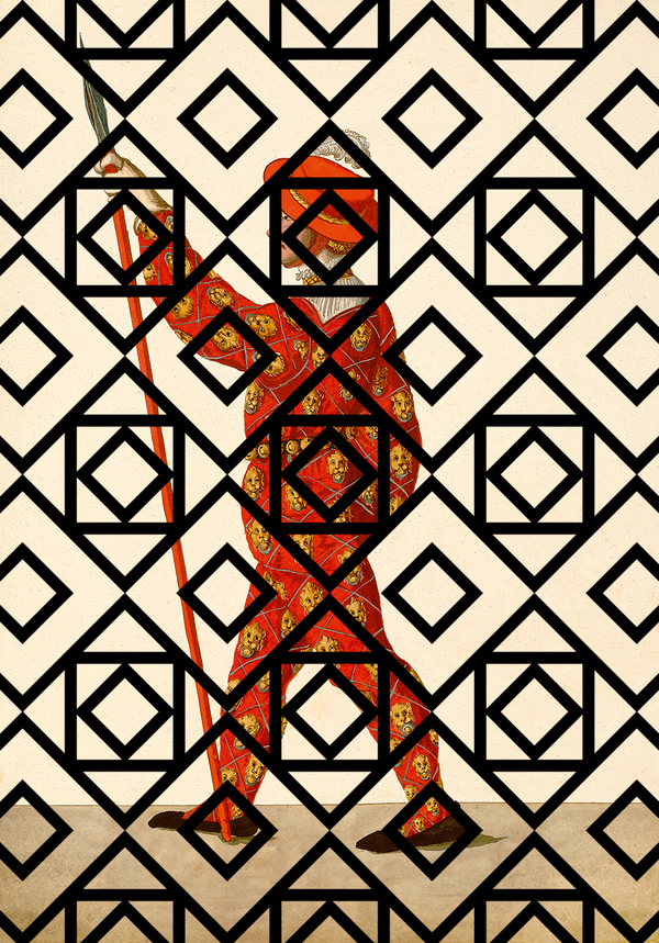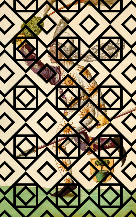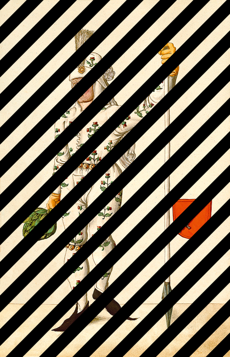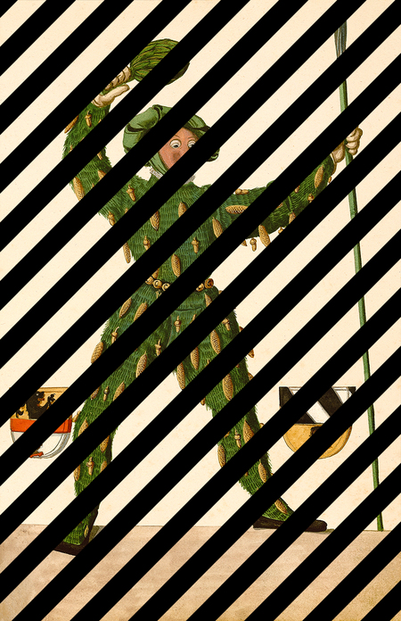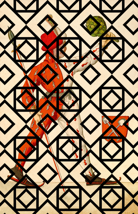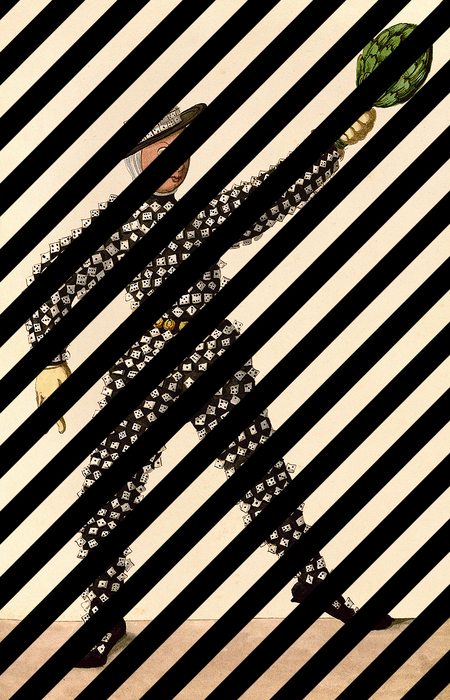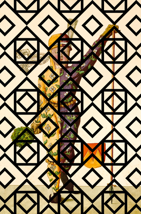 Существовал древний сюжет площадного действа. Об отвлеченных его смыслах, уходящих в глубину веков, говорит понятное для зрителей содержание мотивов, выбираемых для костюмов ряженых. Оболочка Mi-parti с контрастом белой и черной половин, выдержанным в шляпе и перекрестно подчеркнутым обувью, означает взаимосвязь противоположного: День и Ночь, Сон и Смерть. Закручивающийся шарф на шляпе ряженого подтверждает это. Три красных цветка на щите — маки: они с античных времен из-за усыпляющего действия служили знаком сна (атрибут Гипноса, бога сна) и ночи.