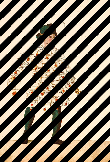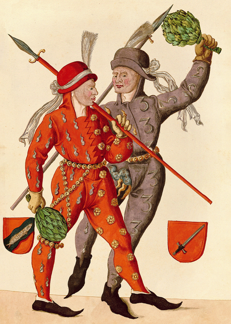 Распространившаяся среди знати мода на вытянутые, затруднявшие ходьбу носки обуви сразу привлекла внимание шутов и ряженых. Эту обувь пародируют, хоть и позволяя нормально переставлять ноги, загнутые носы красных сандалий у нюрнбергского подмастерья, на чьи занятия в будни указывают лопатки в красном поле щита. Его костюм с контрастными половинками дополняют высокая шляпа с круглыми полями и павлиньим пером, сдвинутая набок, и пояс с витыми колокольчиками, произведение нюрнбергских мастеров.