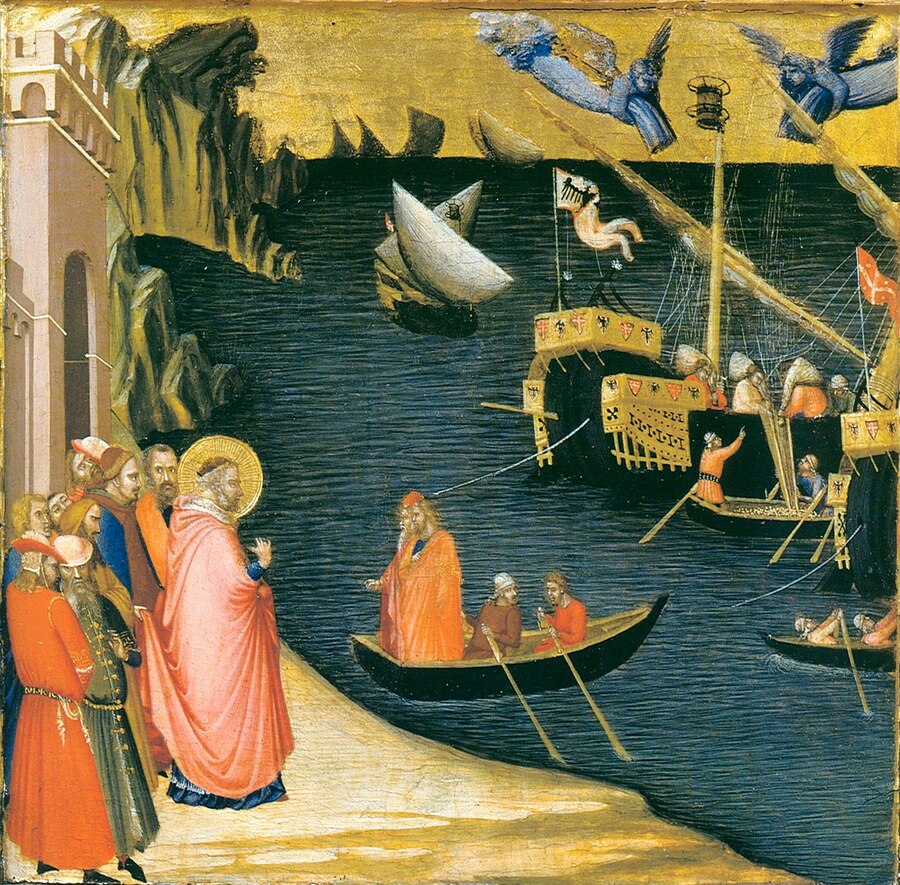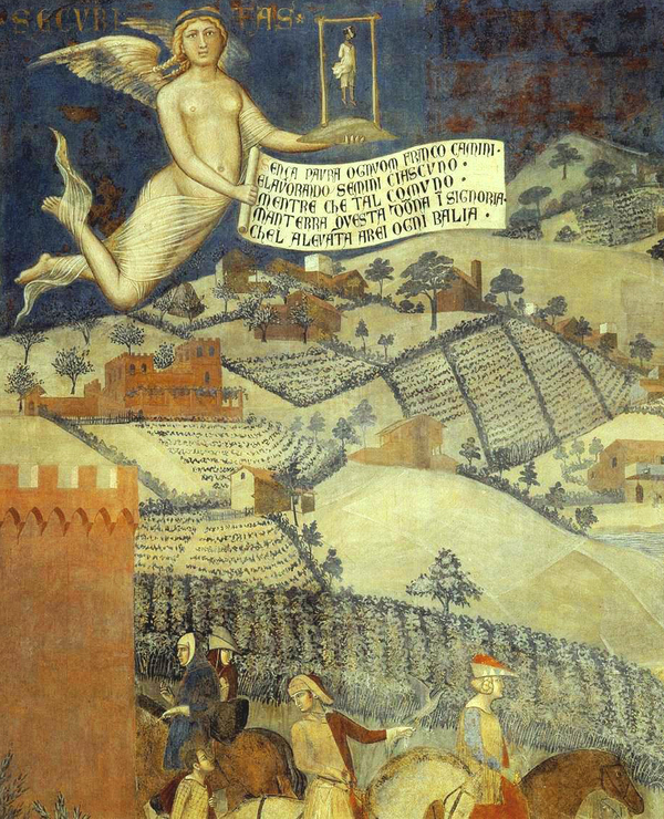 Амброджо Лоренцетти, фрагмент «Сцены из жизни св. Николая», Св. Николай, чудом наполняющий трюмы кораблей зерном, 1330 // Амброджо Лоренцетти, фрагмент фрески «Плоды доброго правления», 1337-1339