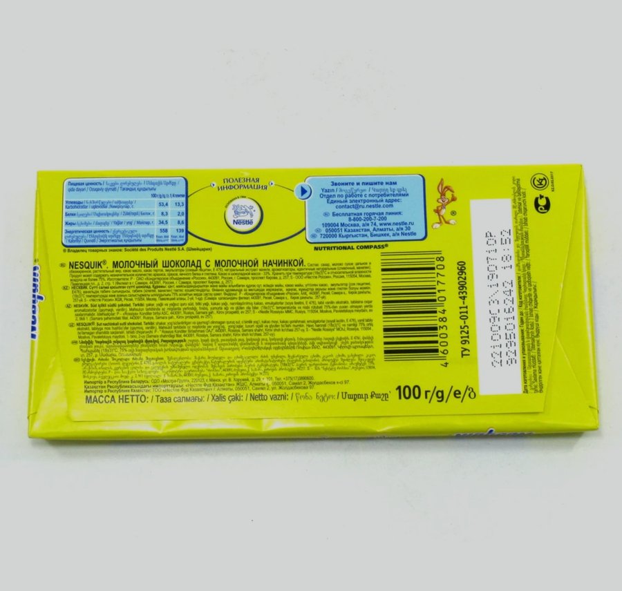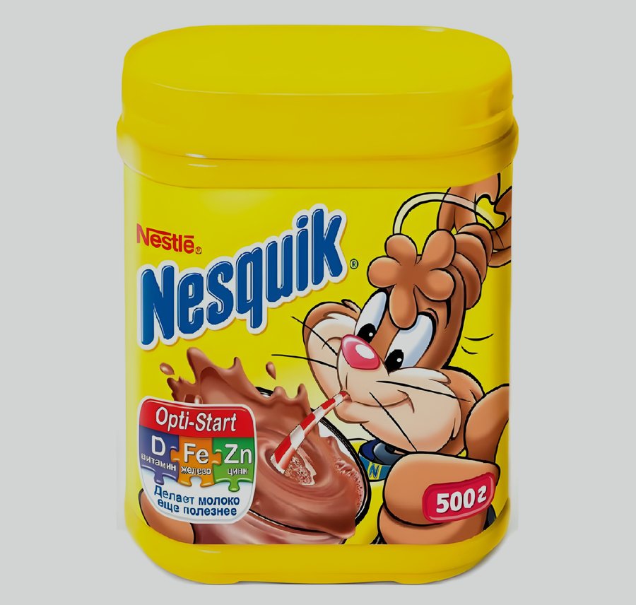 В современной упаковке какао «Бейбифокс» заметно просматриваются мягкие визуальные отсылки к культовой эстетике Несквик начала 2000–2010-х. Они используют схожие выразительные приёмы, хорошо закрепившиеся в визуальной памяти поколения. Характерная жёлто-синяя палитра сразу вызывает ассоциации с «солнечным» ощущением детских завтраков и утренних рекламных роликов. Крупная, массивная типографика слова «КАКАО», выведенная тёплым коричневым тоном с объёмной тенью, также перекликается с приёмами, популярными в оформлении детских продуктов того периода.
