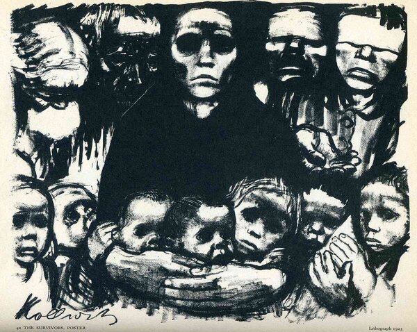 Во время Первой мировой она помогала в столовых и занималась с чужими детьми. Социально активную позицию Кольвиц сохранила и после: создавала работы, освещающие проблемы голода и призывающие не допускать больше войн.