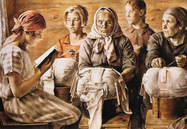 Евгений Кацман, «Калязинские кружевницы», 1928 и Аркадий Пластов, «Жатва», 1945