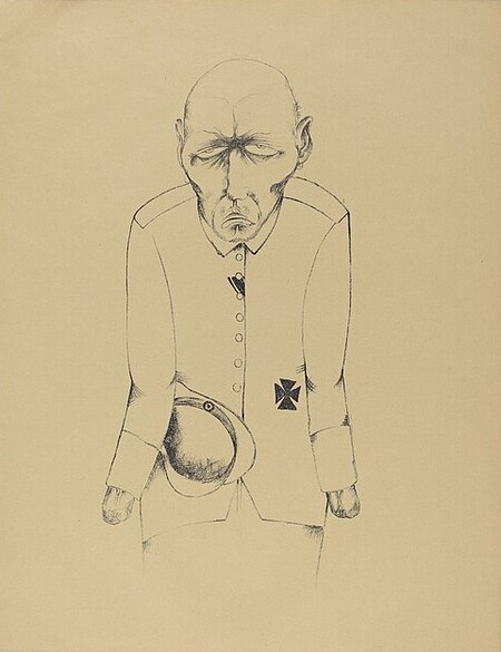 Первая мировая дала новую категорию взрослого — участника войны. Конечно, и в прошлые века создавались портреты военных, но образ, объединяющий солдата и жертву, отражающий травму пережитого появляется только сейчас. Произведения, демонстрирующие такой образ есть у экспрессионистов («Автопортрет в солдатской форме» Э. Л. Кирхнера), но, наверное, наиболее ярко этот посыл проявился в «новой вещественности».