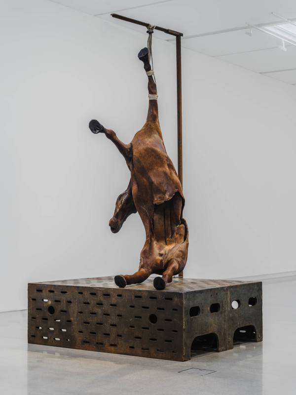 В кинетической скульптуре «Карусель» таксидермические слепки животных подвешены к вращающемуся металлическому механизму и медленно движутся по кругу, касаясь пола. Их тела лишены индивидуальности и выглядят вытянутыми и обезличенными, словно застывшие в состоянии между жизнью и объектом. Науман помещает животное в жесткую механическую систему, где природная форма превращается в холодную структуру без биологического присутствия. Работа подчеркивает конфликт между живым и искусственным и показывает, как насилие и смерть становятся частью визуального языка современного искусства.