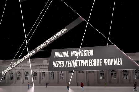 В проекте представлены макеты графического и архитектурного фасадов к выставке «Солнце Поповой». Графический фасад представляет собой экран с анимацией. На нем рисунки для тканей сочетаются с живописью художницы. Архитектурный фасад — конструкция, выполненная по одному из проектов Любови Поповой для театральной постановки.