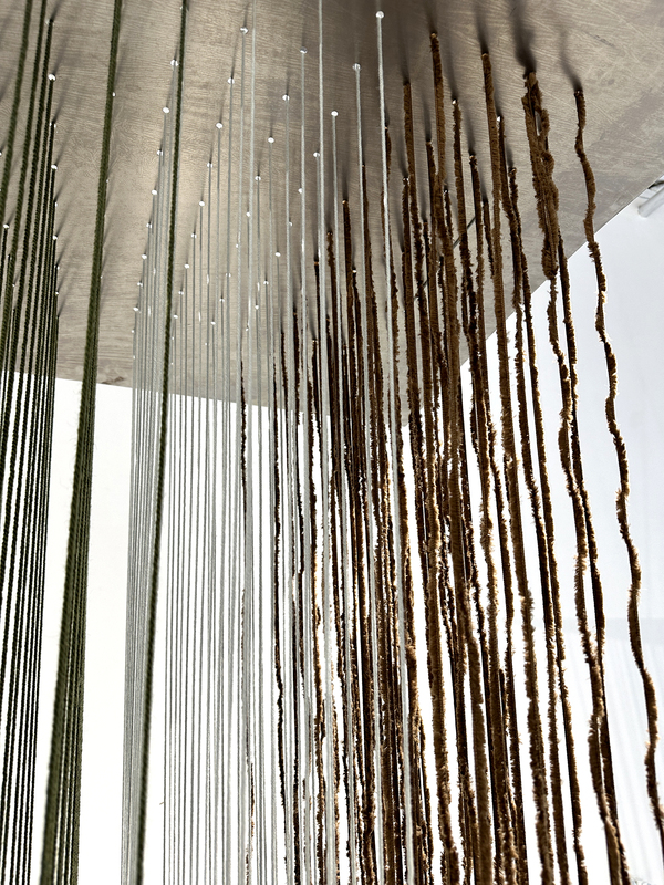 «Созависимые» — это метафора хрупкого баланса и деформированной свободы. Работа заставляет зрителя задуматься о природе зависимостей, о том, как одна личность может подавлять или деформировать другую: насколько непрочны и изменчивы могут быть границы между субъектами. Нити находятся в неком натяжении между пластинами: они почти до разрыва находятся в постоянном напряжении. В центре композиции — две металлические плоскости, соединенные множеством тонких нитей.