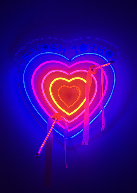 Инсталляция имеет размеры 2 м на 2 м, выполнена из оргстекла и неона. Также к инсталляции прилагаются стрелы и лук. Для большего придания китча при попадании в сердце начинают играть различные хиты про любовь: от «Я люблю тебя до слез» Александра Серова, до «Careless Whisper» Джорджа Майкла.