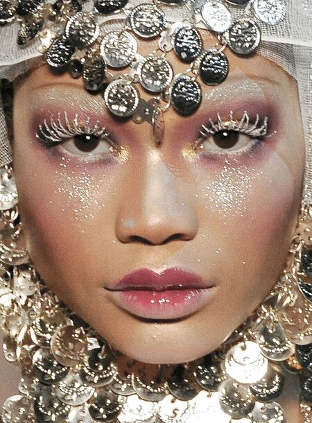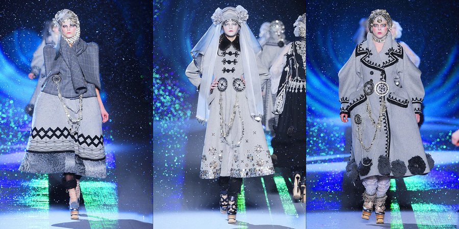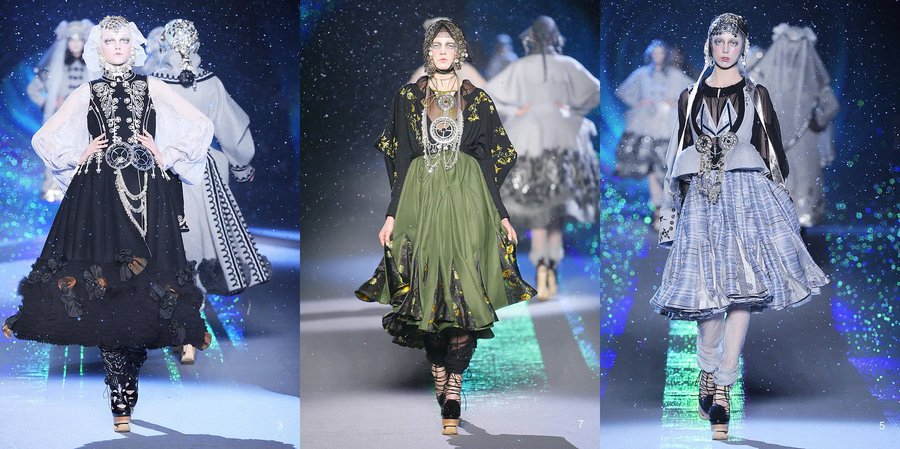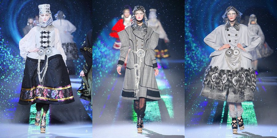 Щит, камзол и орнамент Джона Гальяно. Круглые металлические элементы присутствуют на всех моделях показа, и это не что иное как фигурки щитов. Ромбы, круги, строчки по контуру одежды, интерпретация народного костюма аналогичны художественным приёмам Ольги Кручининой.
