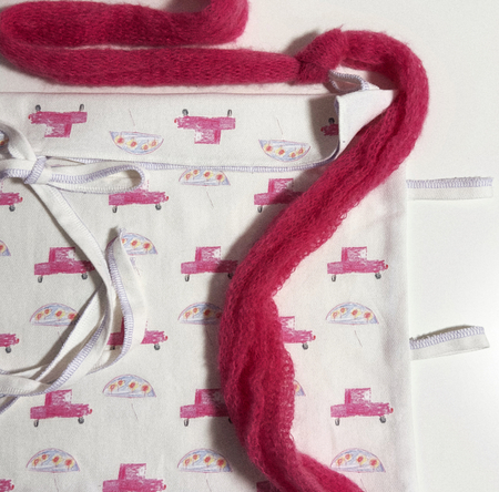 В качестве принта для шоппера используется разработанный на основе детских рисунков паттерн. Ручкой для шоппера служит съемный шарфик. Форма шоппера изменяется в зависимости от выбора закрепления шарфика на основе.