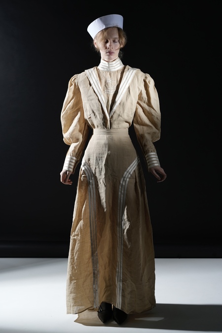 Костюм для яхтинга, вдохновленный историей мореплавания, отражает эволюцию роли женщин в традиционно мужском мире. Он сочетает в себе элементы формы военно-морского флота и элегантного женского платья, подчеркивая силу и независимость женщин.
