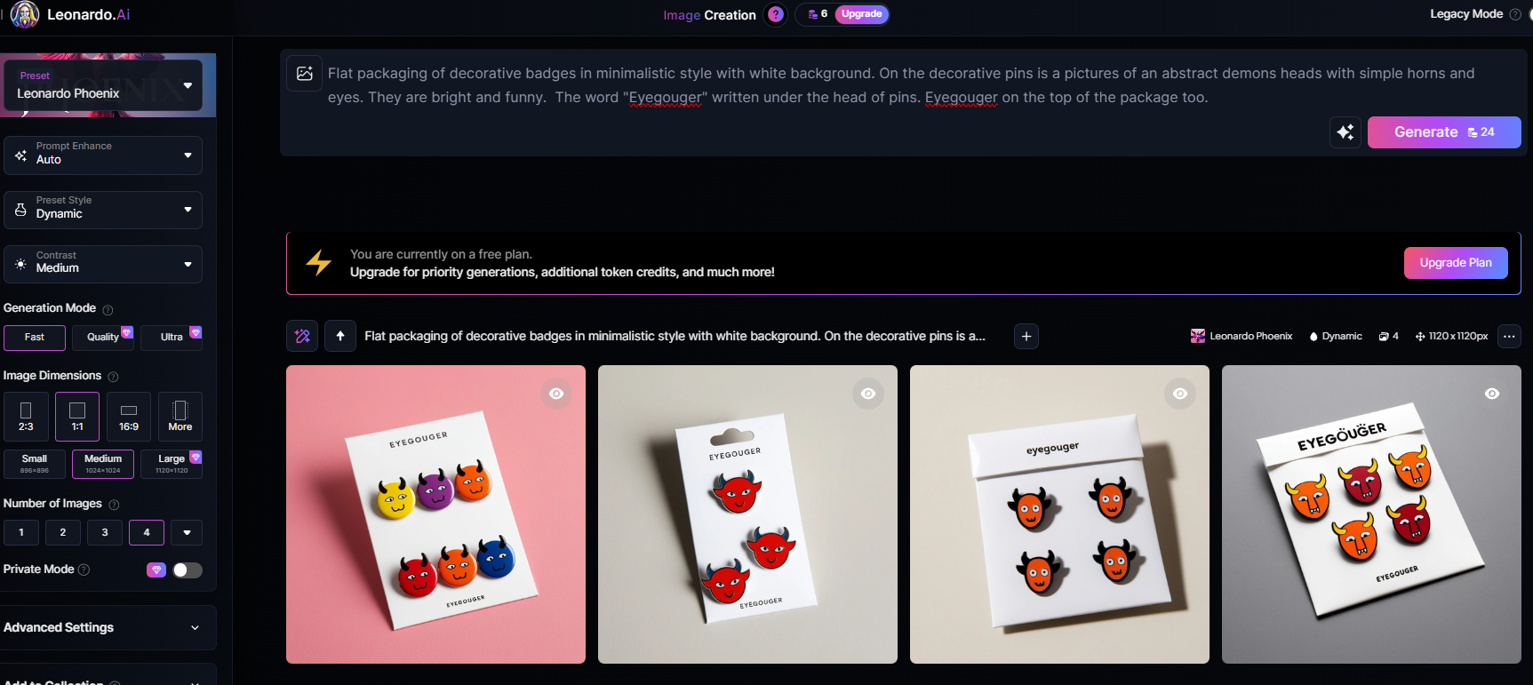 Важное примечание к дальнейшей работе: я перевела через несколько переводчиков свой бренд «Вырвиглаз» дословно как «Eyegouger». Поэтому нейминг продукта в генерациях может встретиться на двух языках: английском или русском. К сожалению, иногда айдентика может быть написана на выдуманном языке со схожими начертаниями этих слов в виду сложности такой процедуры, как генерация шрифтов и надписей.