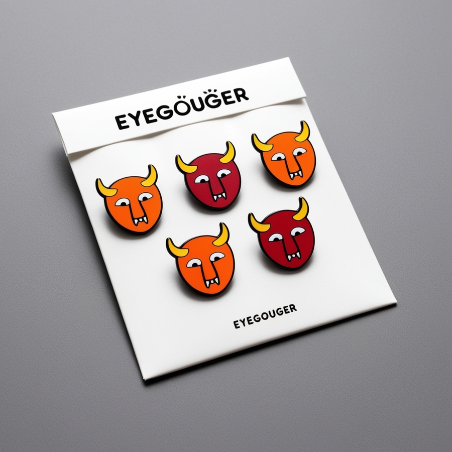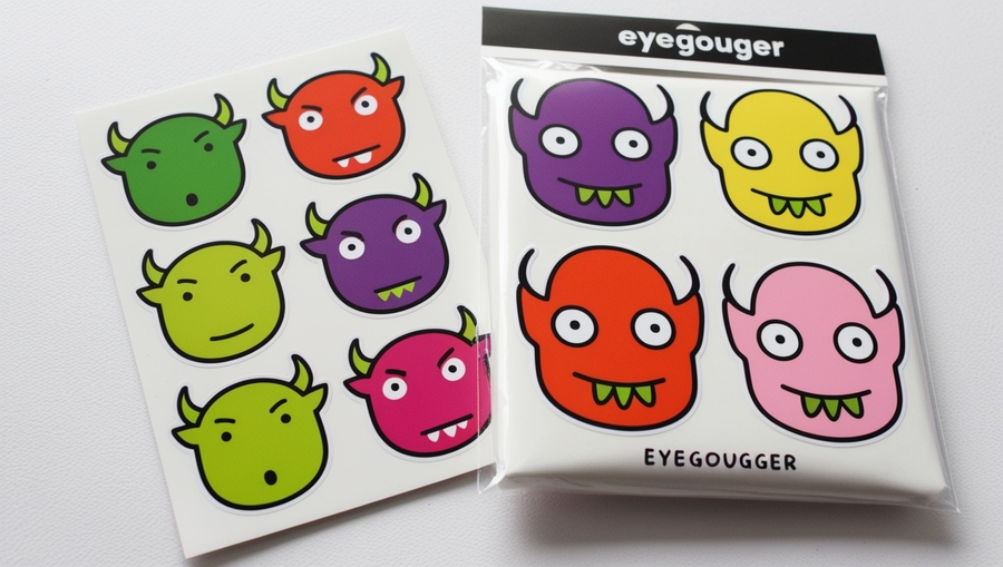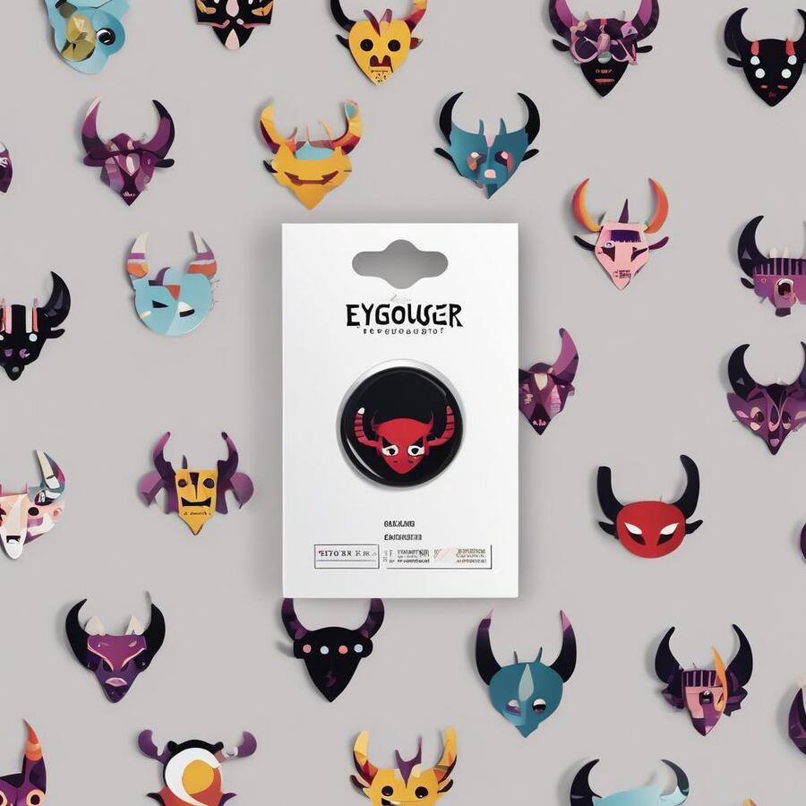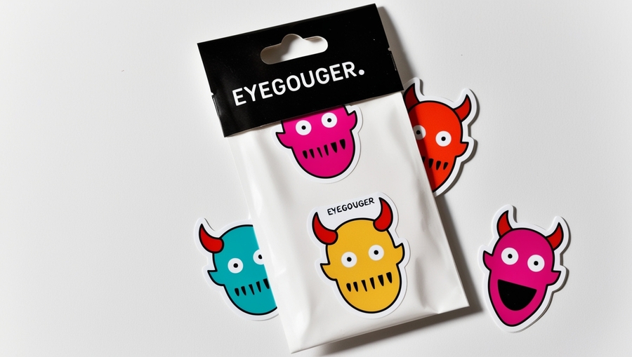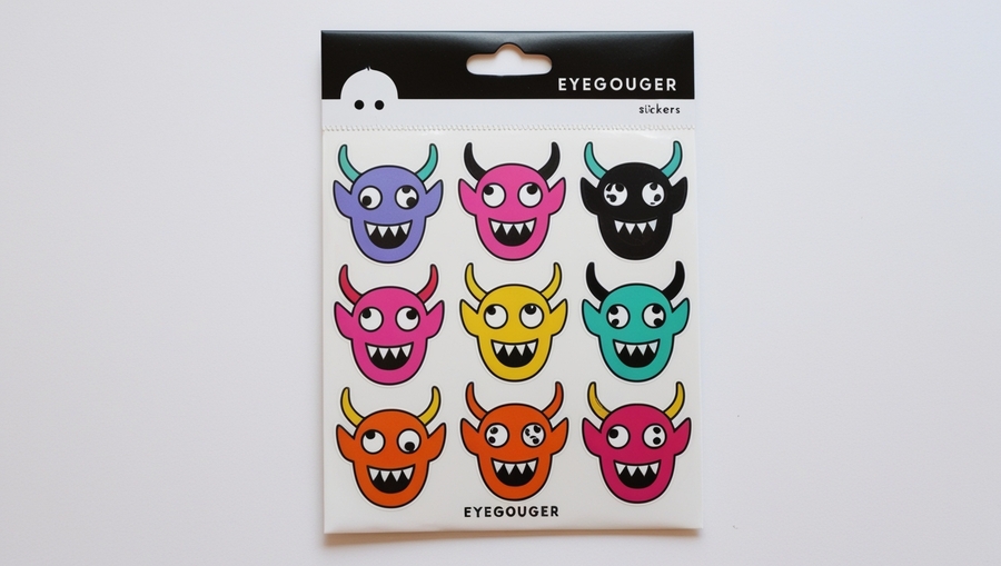 Текст промпта: Flat packaging of decorative stickers in minimalistic vector style with white background. Stickers is a different abstract demon heads with simple horns and eyes with different emotions. Emotions on faces can be funny gorgeous angry surprised. Mouths open and has simple finny teeth. Demon designs of heads are vibrant bright and funny unusual. Different bright colours like pink yellow red green blue. The word «Eyegouger» written under the head of pacage. Eyegouger on the top of the package of stickers too.