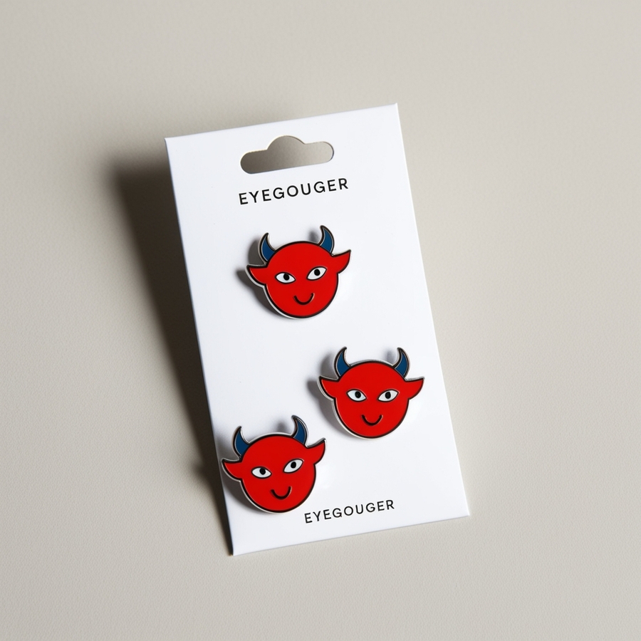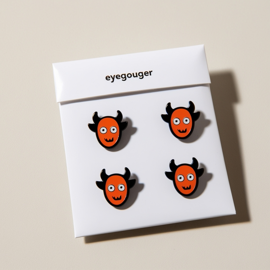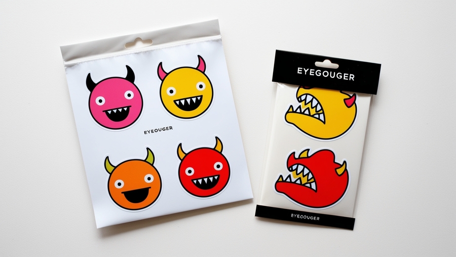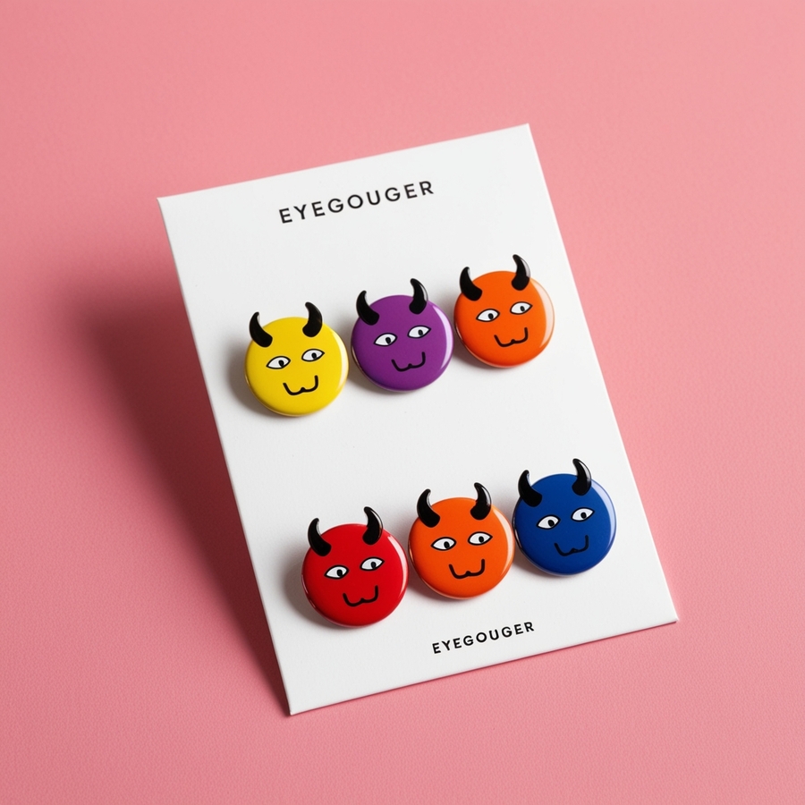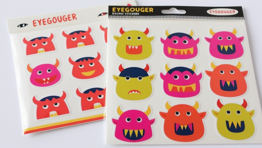 Текст промпта: Flat packaging of decorative stickers in minimalistic vector style with white background. Stickers is a different abstract demon heads with simple horns and eyes with different emotions. Emotions on faces can be funny gorgeous angry surprised. Mouths open and has simple finny teeth. Demon designs of heads are vibrant bright and funny unusual. Different bright colours like pink yellow red green blue. The word «Eyegouger» written under the head of pacage. Eyegouger on the top of the package of stickers too.