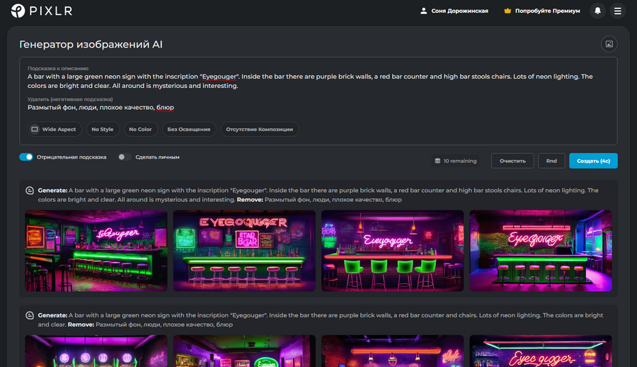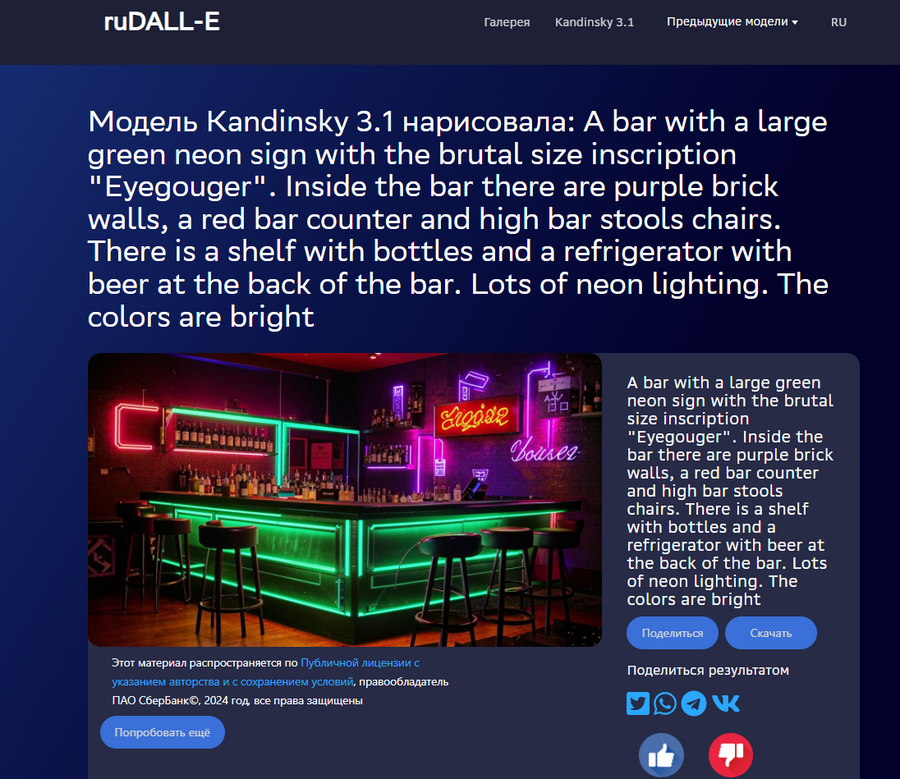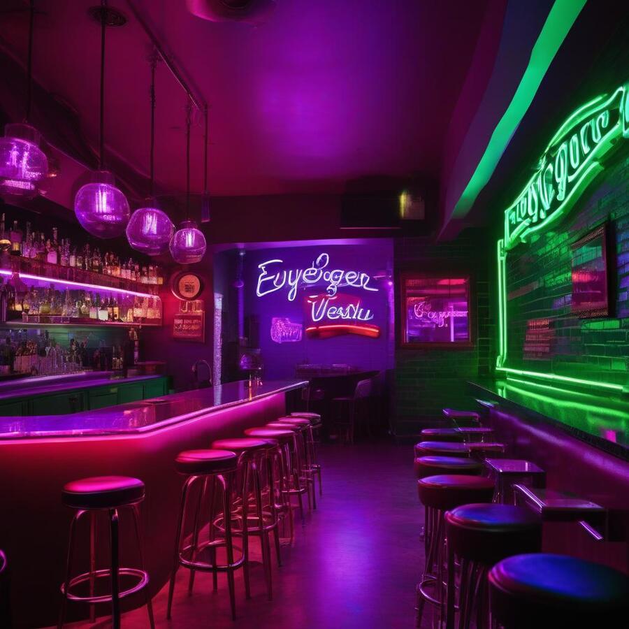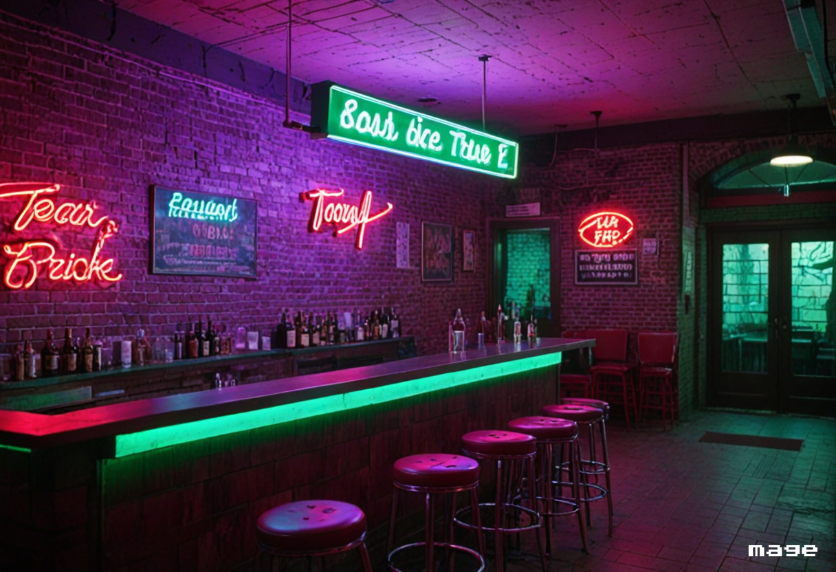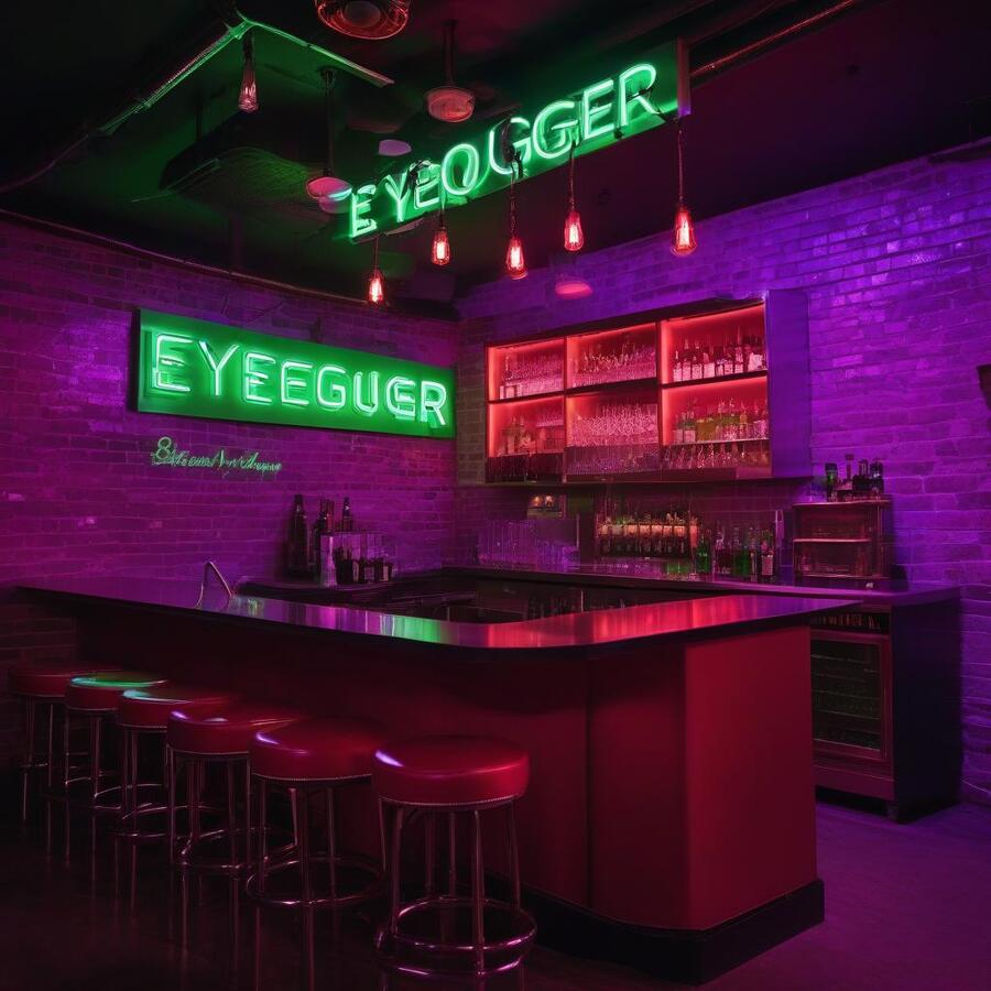 Один из вариантов промпта: A bar with a large green neon sign with the brutal size inscription «Eyegouger». Inside the bar there are purple brick walls, a red bar counter and high bar stools chairs. From behind is refrigerator with beer at the back of the bar. Lots of neon lighting. The colors are bright and clear. No people around.