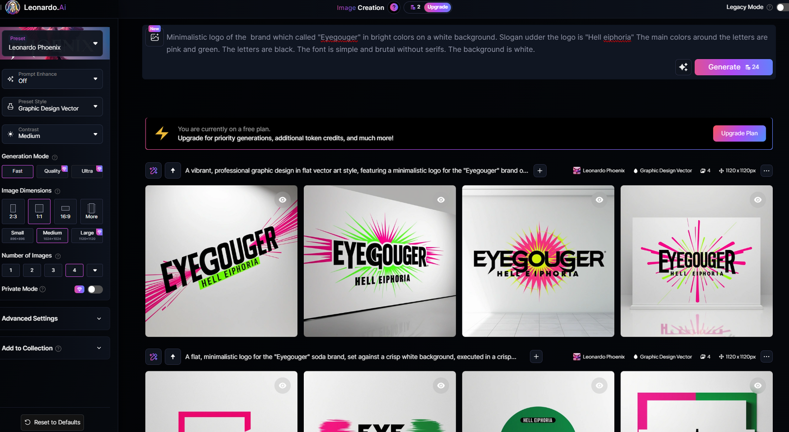 Делюсь последовательностью своей работы с искусственным интеллектом на примере создания логотипа и типографики, которую я выложила в подразделе «Айдентика бренда „Вырвиглаз“»: 1. Исходя из моего оригинального проекта я поставила себе задачу — сделать минималистичный логотип, в основе которого яркие цвета и простой, угловатый шрифт и т. д. 2. Выбрала инструмент: ideogram.ai 3. Определяю ключевые слова промпта на английском: Bright, Vibrant, Logo, bold, simple, minimalism, flat vector art style и т. д. 4. Пишу prompt + negative prompt (туда входят слова: hyperrealism, cinematic, photo, blur poor quality, people heads и т. д.). Настраиваю цветовую палитру, задаю стиль «General» 5. Результаты показались мне не подходящими для айдентики логотипа и более нужными для постеров. 6. Скачала избранные картинки, подписала их чтобы отличать по разным задачам 7. Выбрала другой инструмент: leonardo.ai 8. Вписала туда промпт из ideogram.ai с правками и дополнениями: добавила больше подробностей о пространстве вокруг (black typography и т. д. 9. Забрала то, что меня устроило спустя несколько генраций с правками промпта/пресетов 10. Минимально обработала картинки в Adobe Photoshop