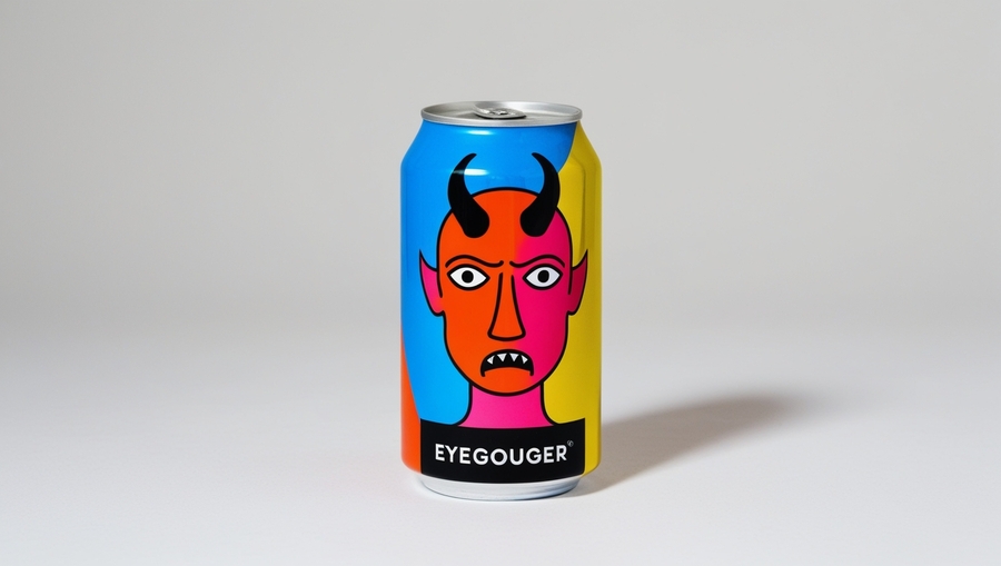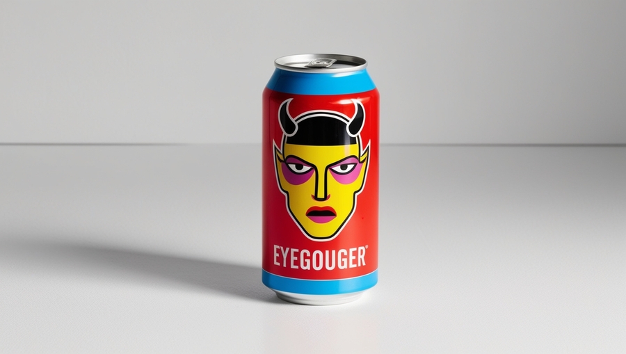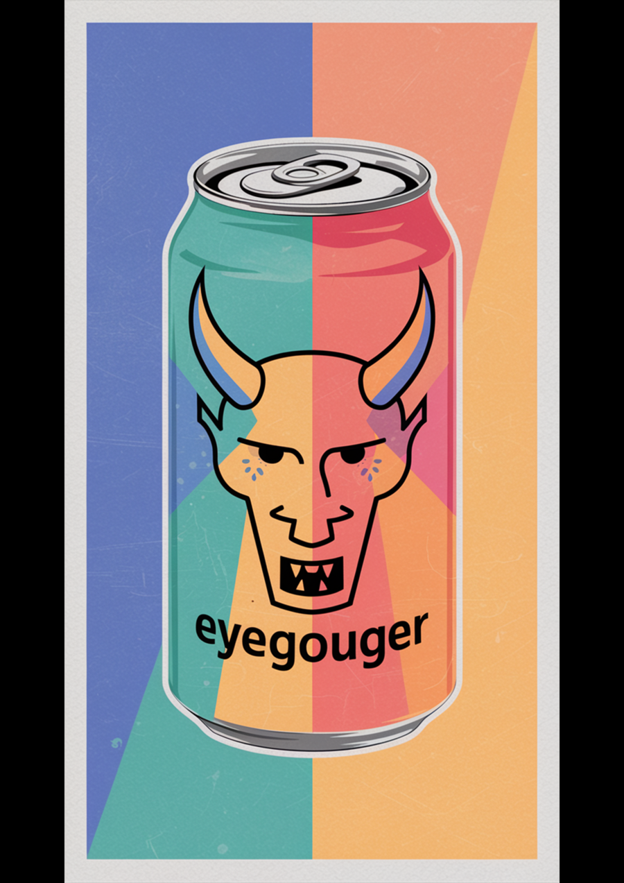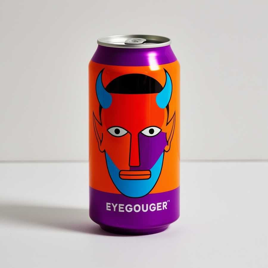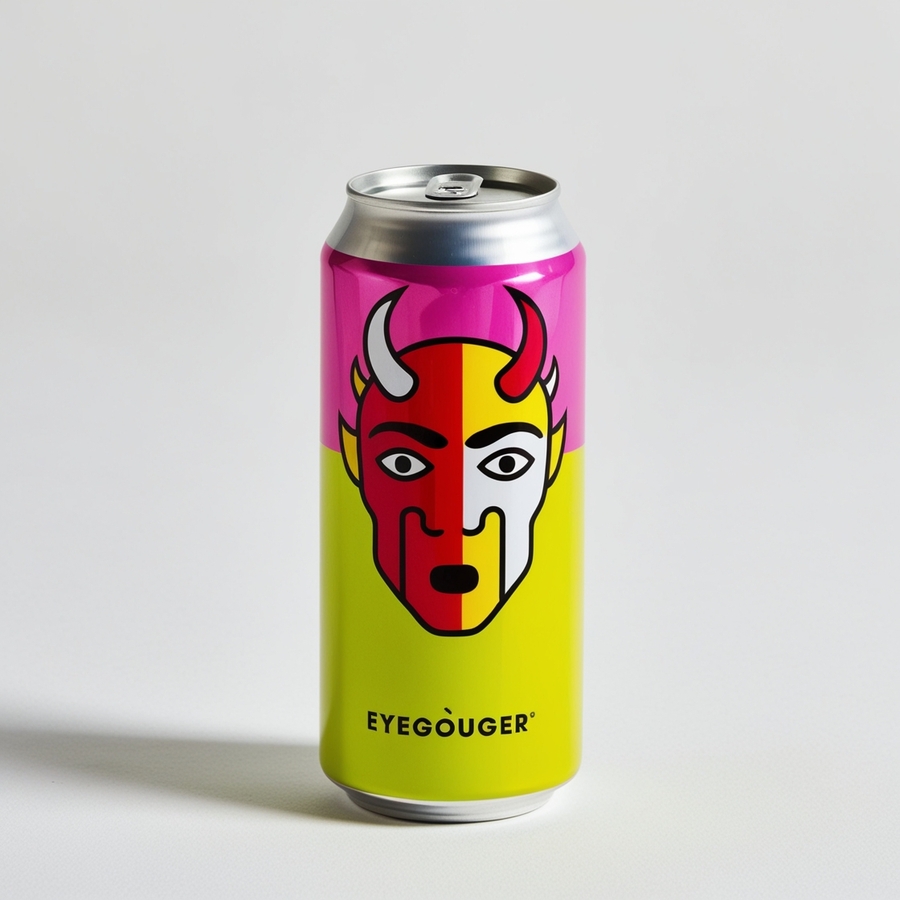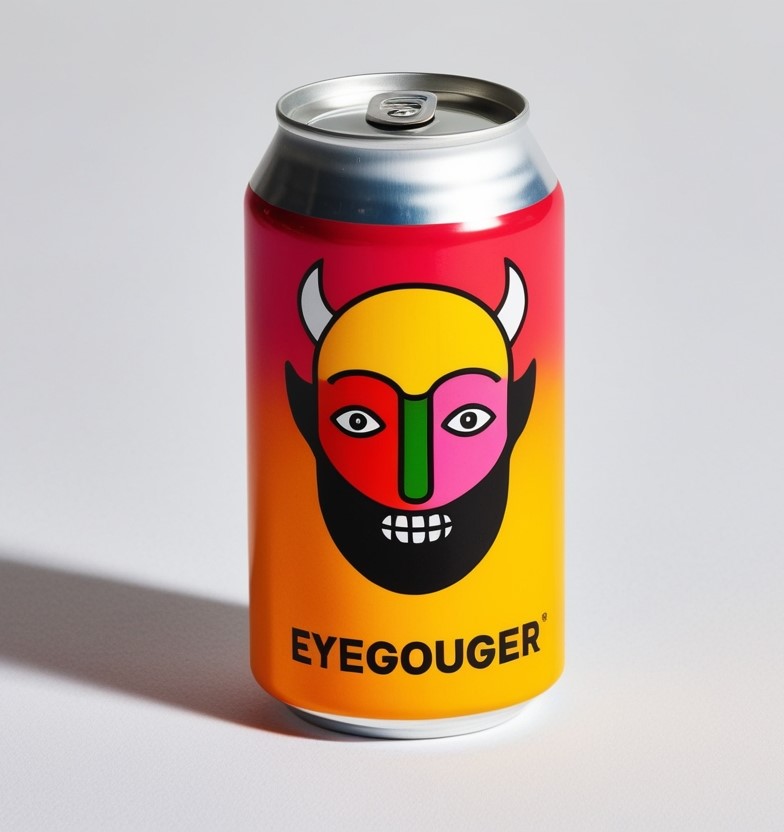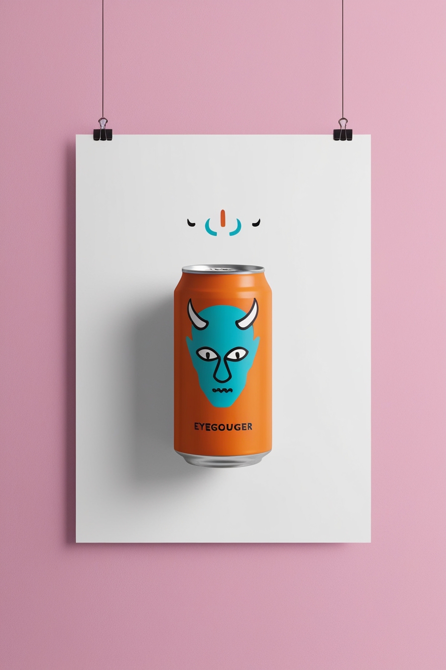Текст промпта: A minimalistic poster with a white background. The poster has a brightly colored soda in the middle. The soda can has a picture of an abstract demon head with simple horns on it and the word «Eyegouger» written under the head. The background is white. Less