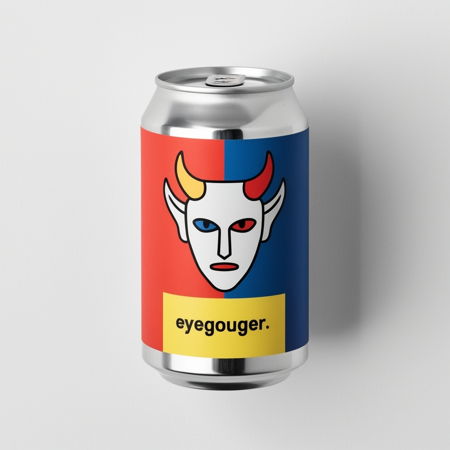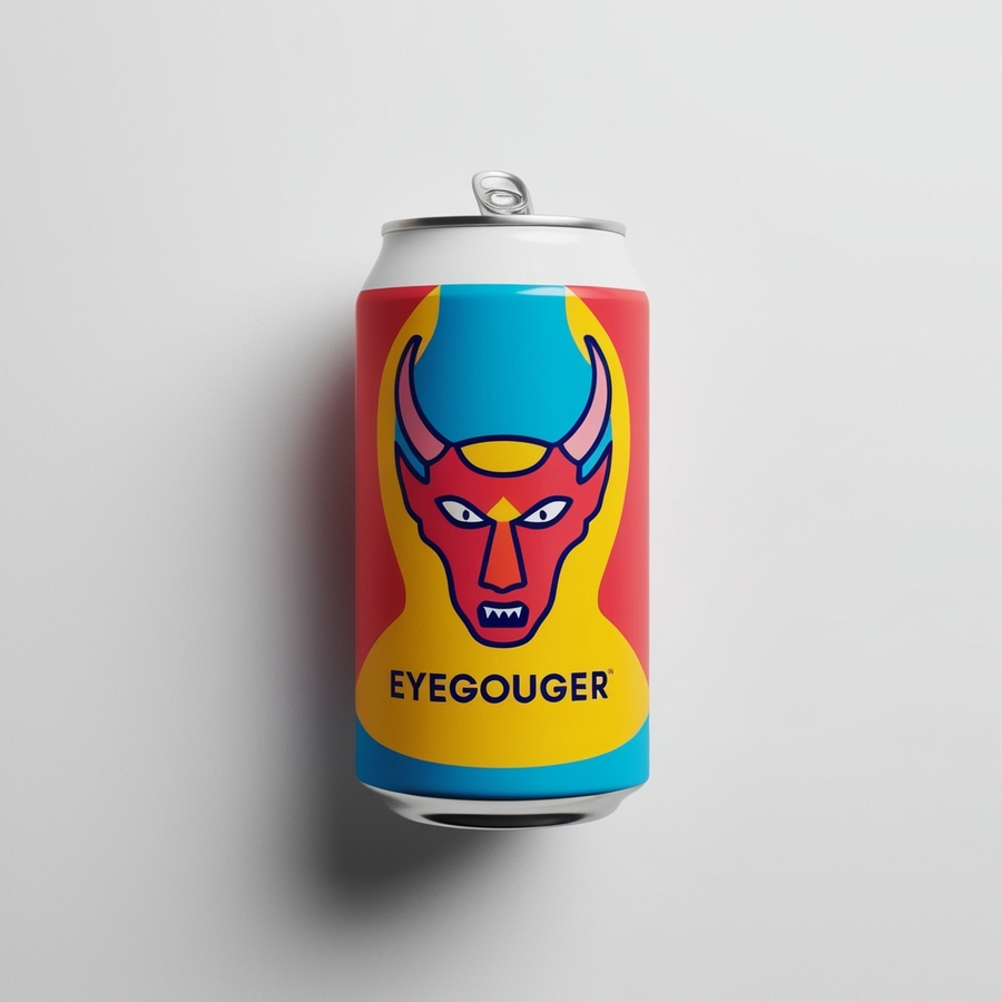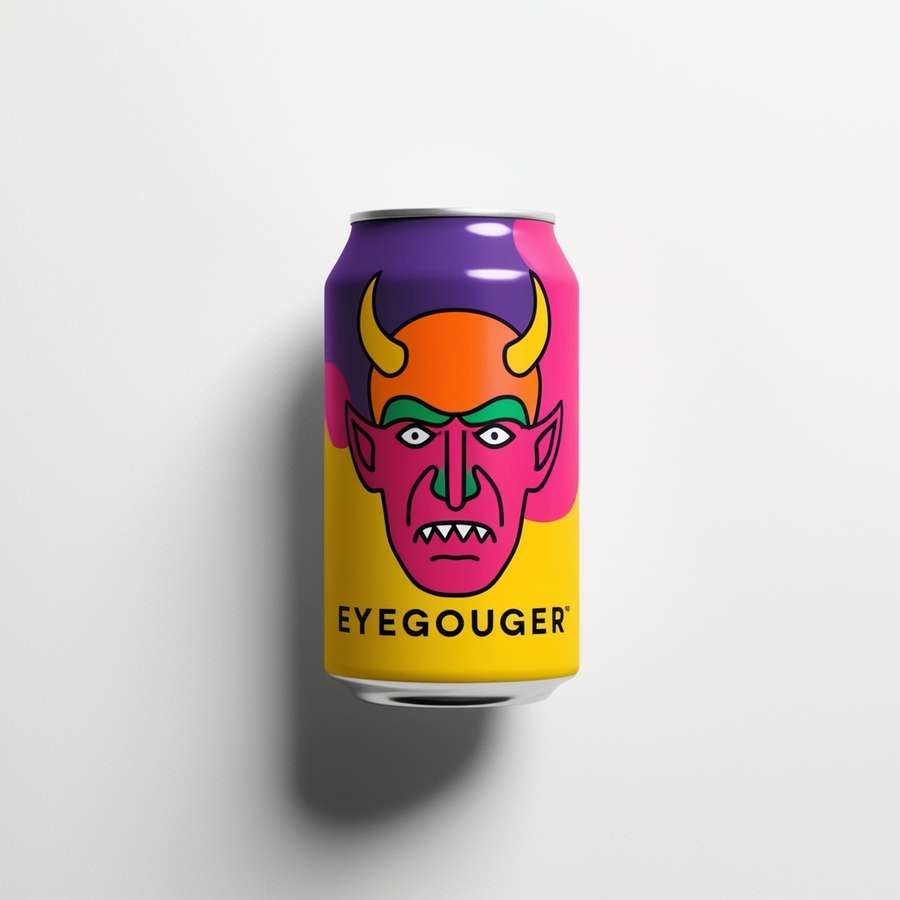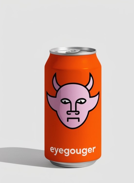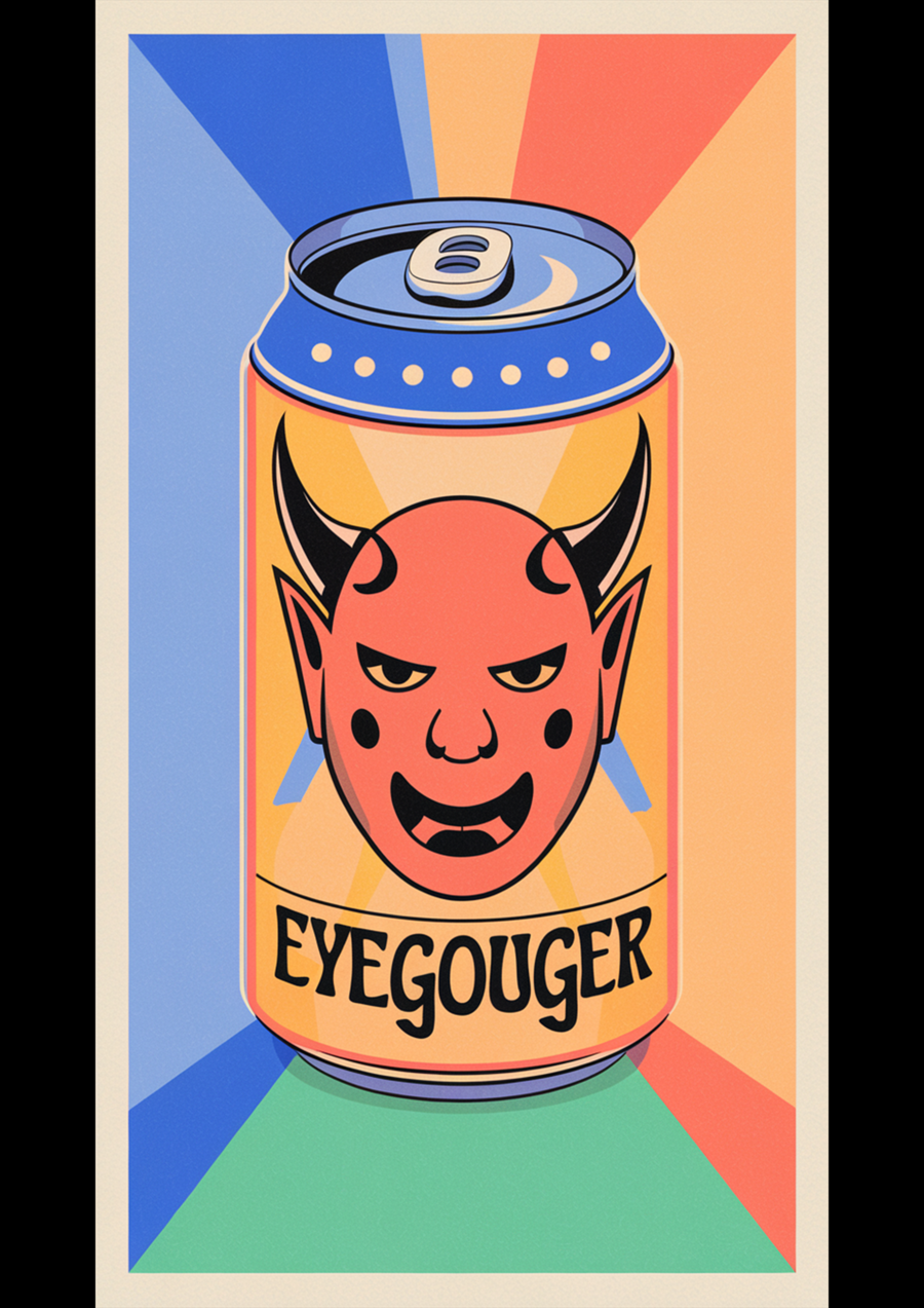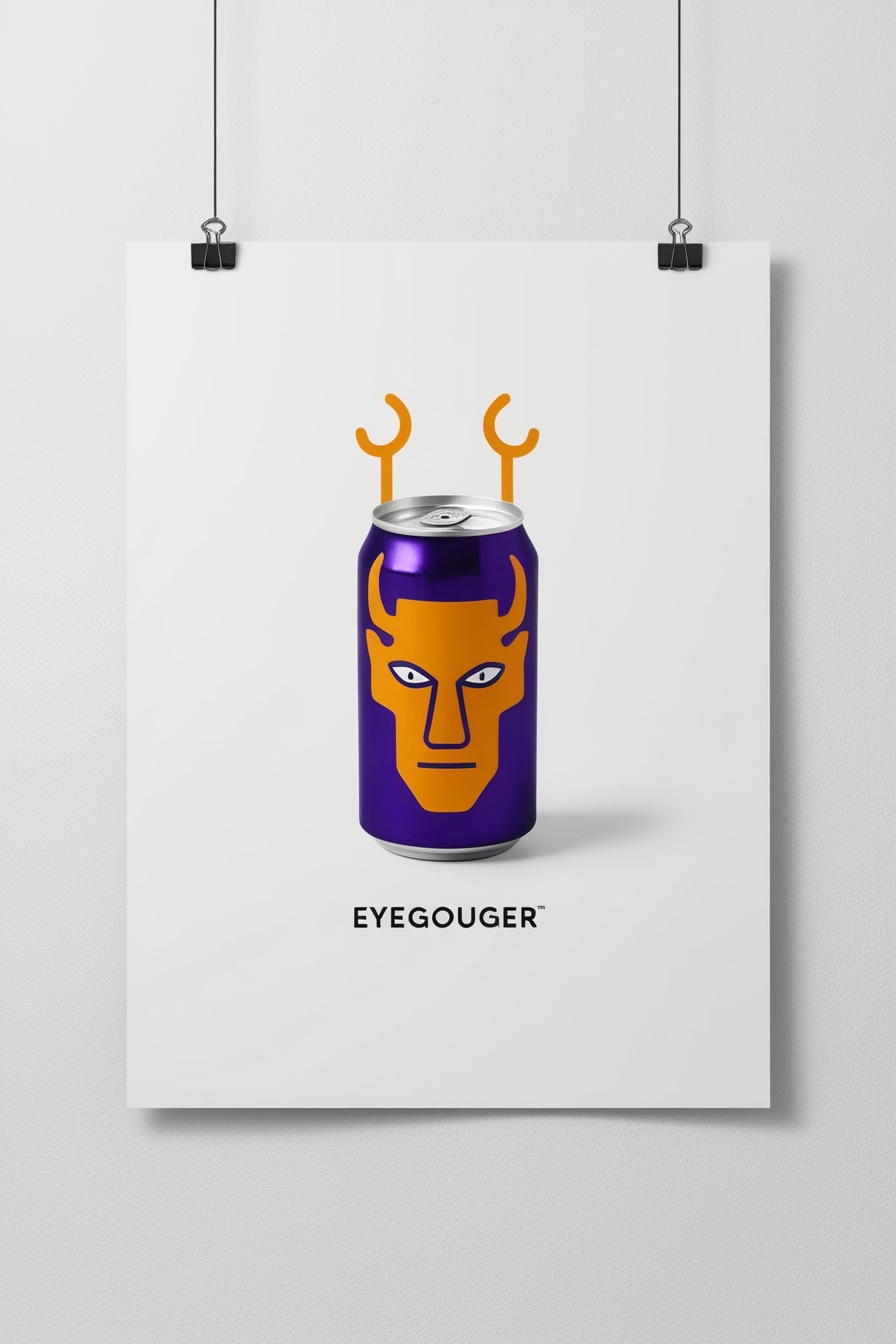 Текст промпта: A minimalistic poster with a white background. The poster has a brightly colored soda in the middle. The soda can has a picture of an abstract demon head with simple horns on it and the word «Eyegouger» written under the head. The background is white. Less