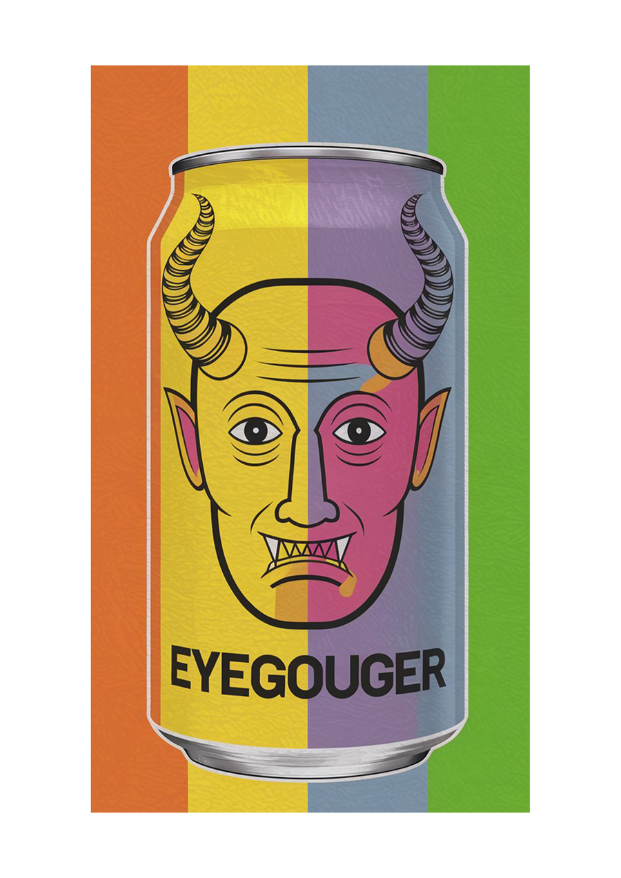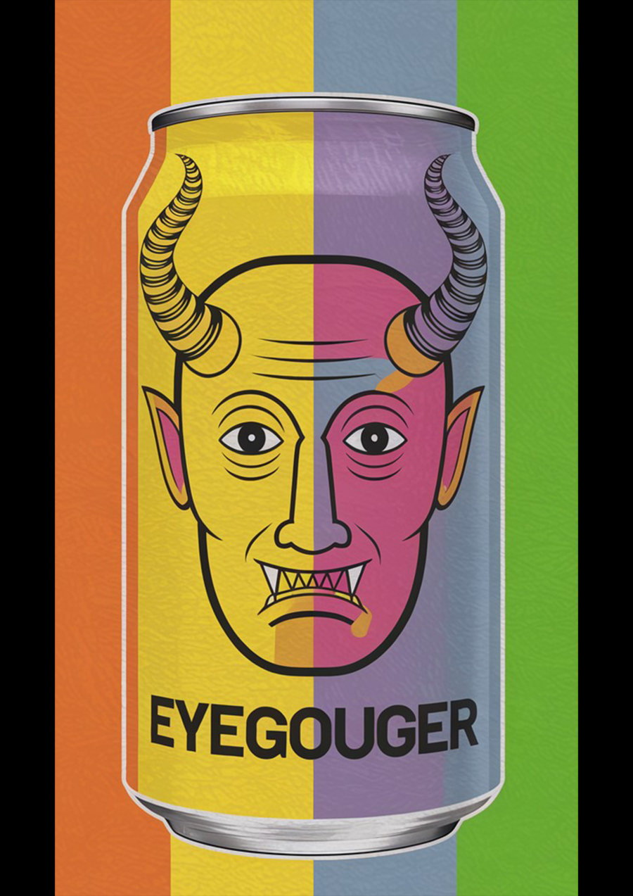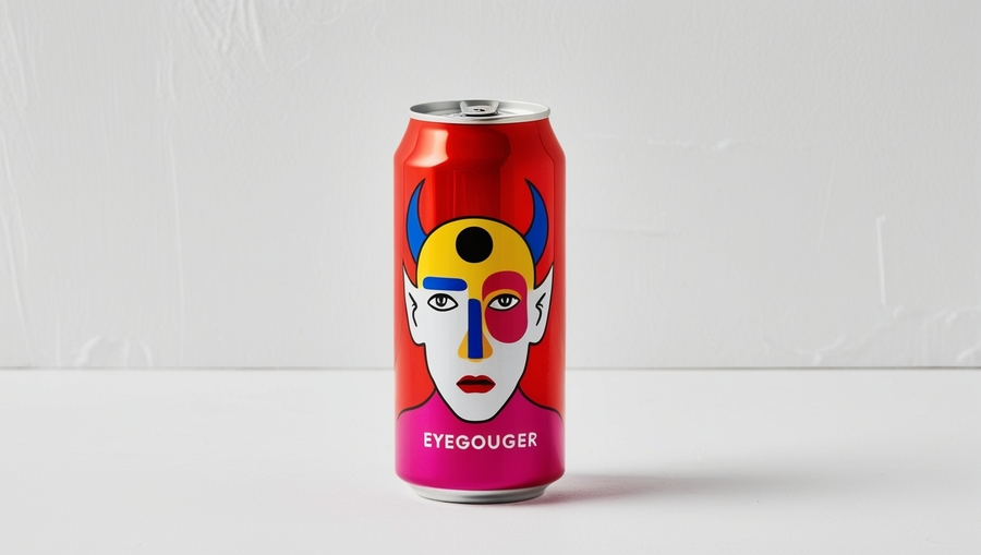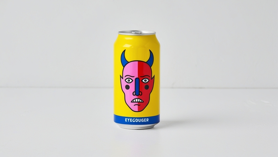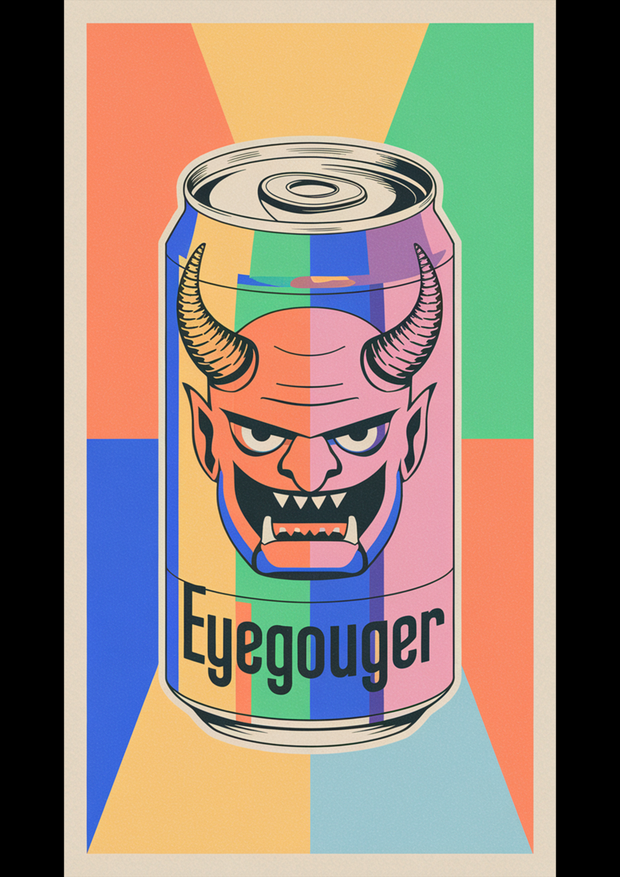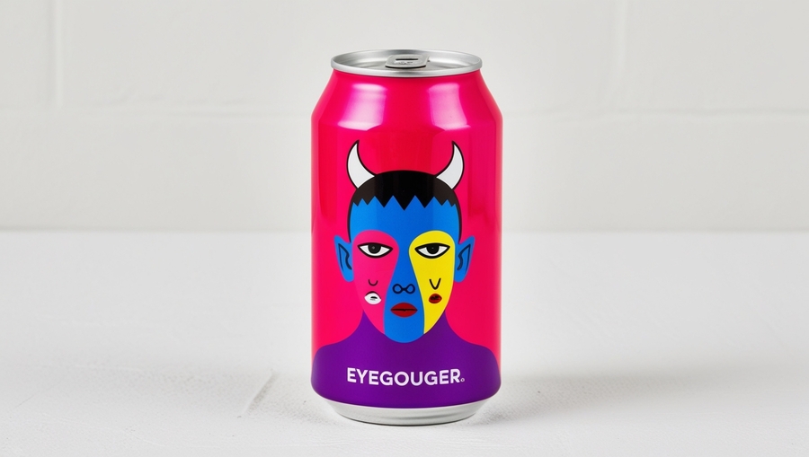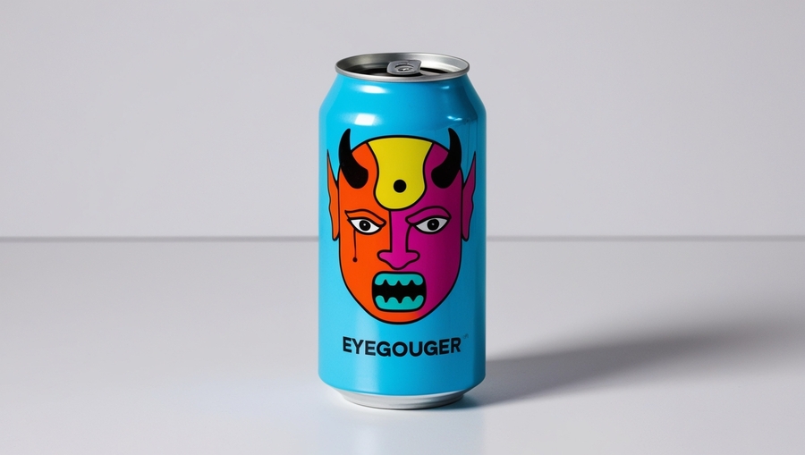Текст промпта: A minimalistic poster with a white background. The poster has a brightly colored soda in the middle. The soda can has a picture of an abstract demon head with simple horns on it and the word «Eyegouger» written under the head. The background is white. Less
