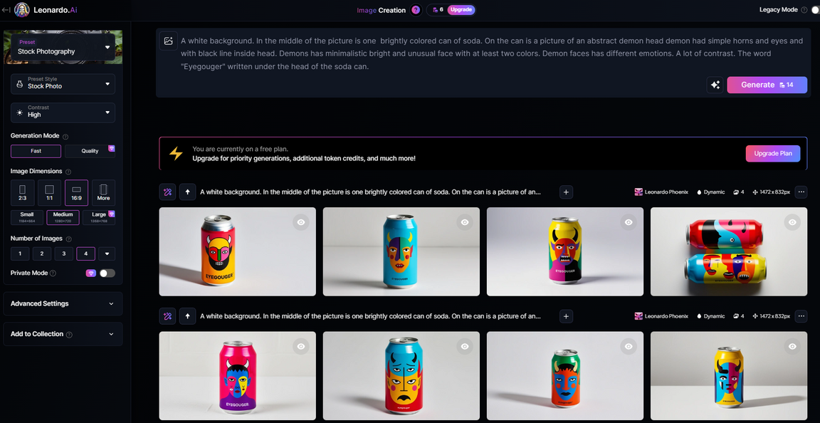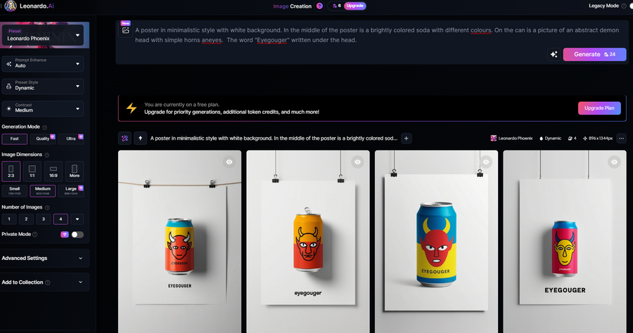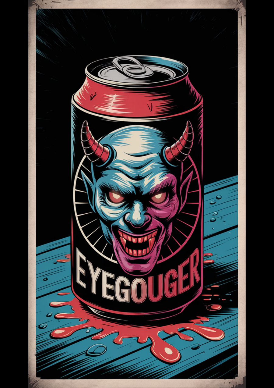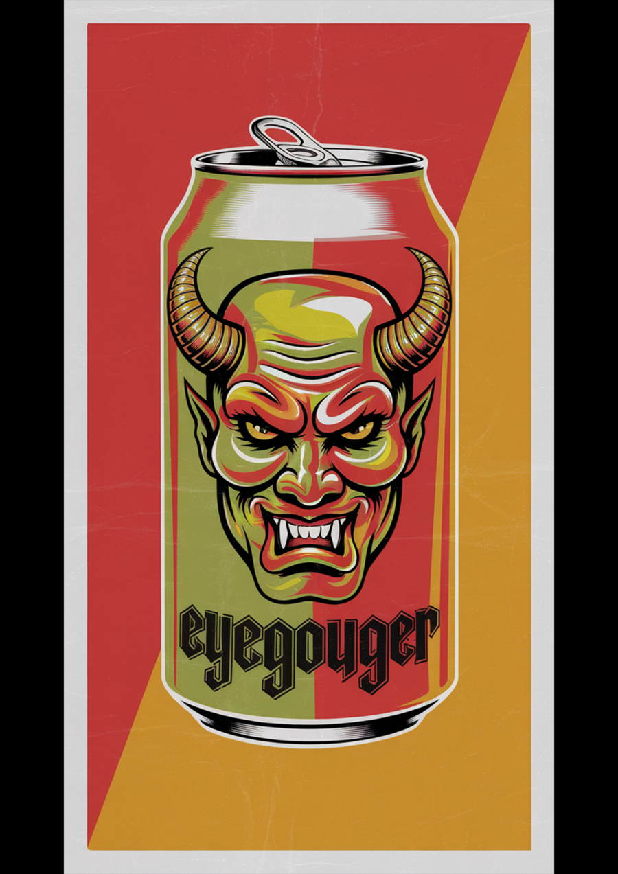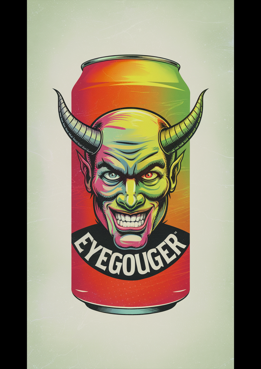 Текст промпта: A poster with white background. In the middle of the poster is a brightly colored soda. On the can is a picture of a demon head with horns and the word «Eyegouger» written under the head.