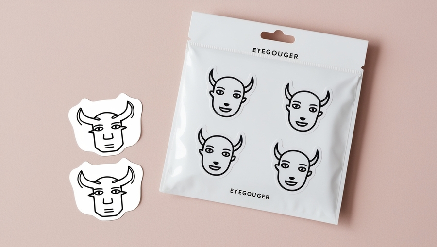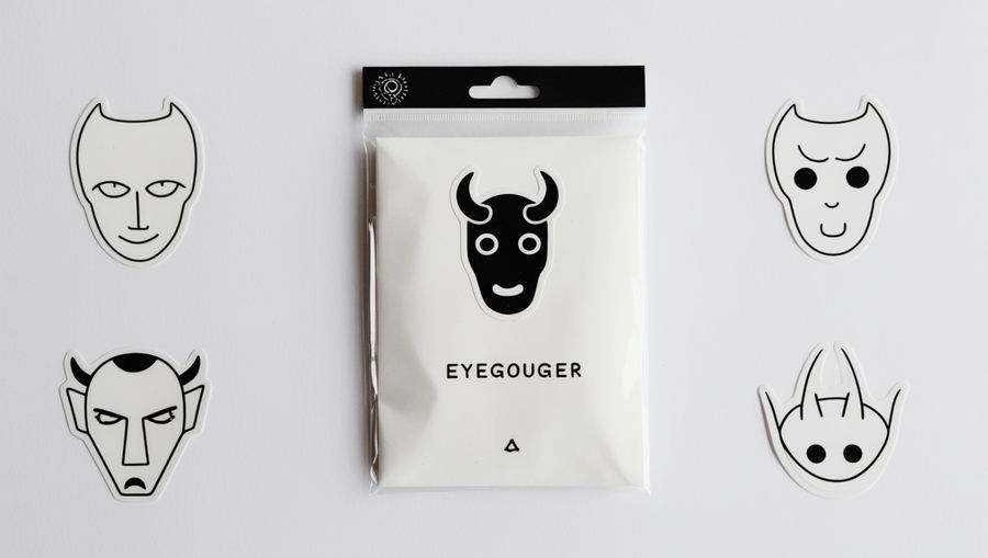 Текст промпта: Flat white packaging of decorative tattoo stickers in minimalistic simple style with white background. Stickers tattoo is a different abstract demon heads with no emotions and with simple horns and eyes. Two mini stickers must be without pack and near to the pack. The word «Eyegouger» written under the packaging. Eyegouger written on the top of the package of tattoo stickers too. Colors white and black only.