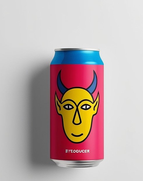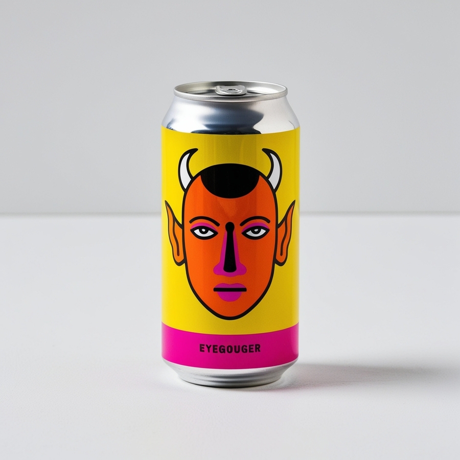 Текст промпта: A minimalistic illustration with white background of a brightly colored soda can with an abstract demon head and the text «Eyegouger» written under the head. Head must have different shapes. Horns with unusual forms. The can is placed on a white background.