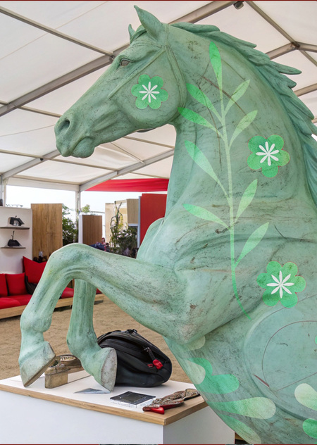 Промпт: Create a close-up image of a big mint-green abstract sculpture of a horse on its hind legs. The sculpture is very expressive and artistic, with very visible strokes of clay. There is an equestrian riding gear exhibition in the background. The space should be open and outside. In the background display a variety of items equestrian accessories. Liberty and nature atmosphere, designer and creative, daylight lighting, natural colors but with red accents.