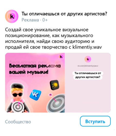 Для удержания привлеченной аудитории проводится акция, в рамках которой при отгрузке двух треков артист получит базовый пакет таргетированной рекламы во ВКонтакте бесплатно. Дополнительно реализован контентный период, направленный на обсуждение и обучение вопросам разработки образа, включая подкасты, интервью и рилсы. Параллельно будет выпускается серия вертикальных видеороликов несущих обучающий и развлекательный характер.