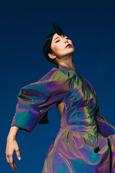 The singer has no musical education. Her technique was developed through individual experiments and deep diving into different vocal traditions. Among the sources of inspiration she refers to  Japanese court music gagaku, European opera singing, Gregorian and Bulgarian choir practices, as well as Buddhist mantras and modern avantgarde. There are no words in her compositions, as well as musical instruments in the traditional sense. All sounds are generated exclusively by a voice — from singing to simulating natural noises such as leaf silk or seaweed.