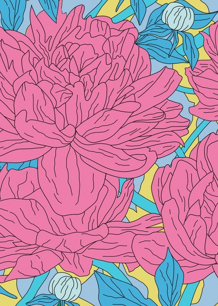 Вторая иллюстрация — паттерн из ярких пионов. Порой очень хочется почувствовать тепло летнего солнца и яркий цветочный аромат.