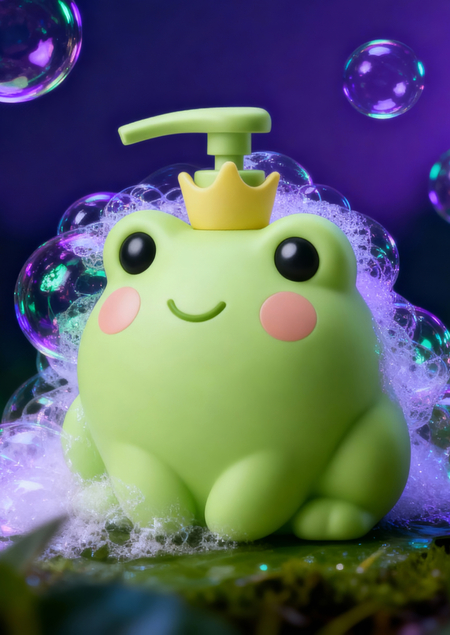 Очаровательные дозаторы-лягушки в коронах содержат мягкие гипоаллергенные формулы: жидкое мыло, шампунь без слёз и гель для душа.