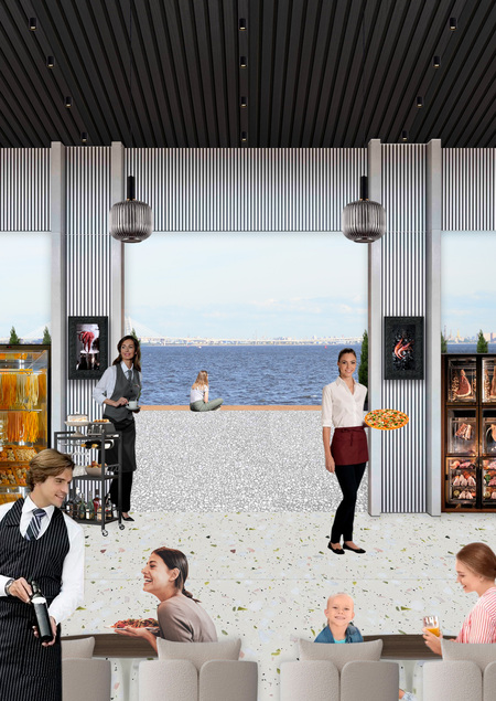 Главный зал ресторана разделен на четыре тематических зоны и включает в себя морскую, итальянскую, испанскую зону и зону бара. В зависимости от ситуации активность может быть ориентирована наружу и строиться в синергии с происходящим на набережной или может быть смещена в сторону острова с баром и тематической кухней.
