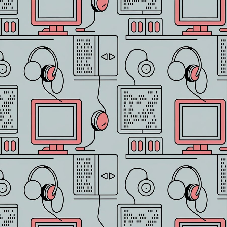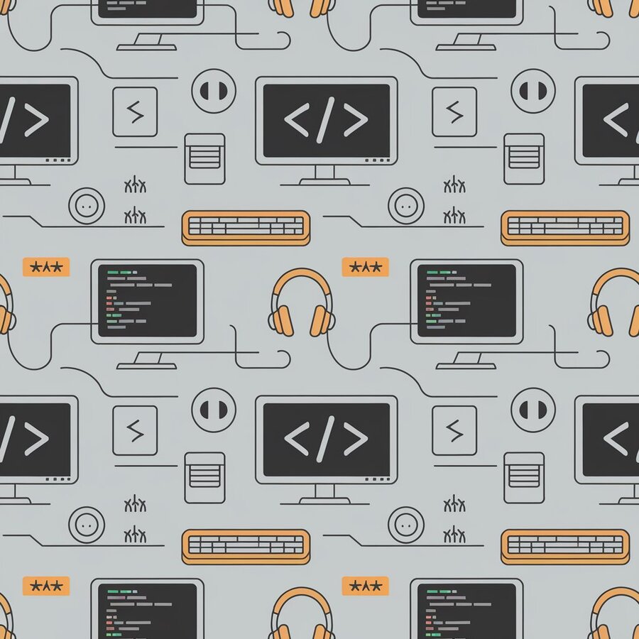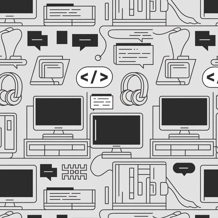 Фирменный паттерн: ideogram.ia («Create a simple vector pattern for computer club. Use images of computers, hearphones and some code. Clean lines, lots of background, repeatability, just stroke, no color»).