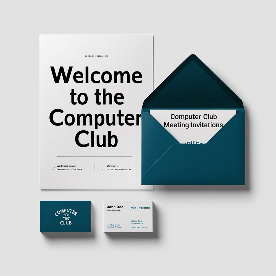 Документация: ideogram.ia («generate a mockup of printed materials (paper, envelope, business cards) on a white background for the computer club»)