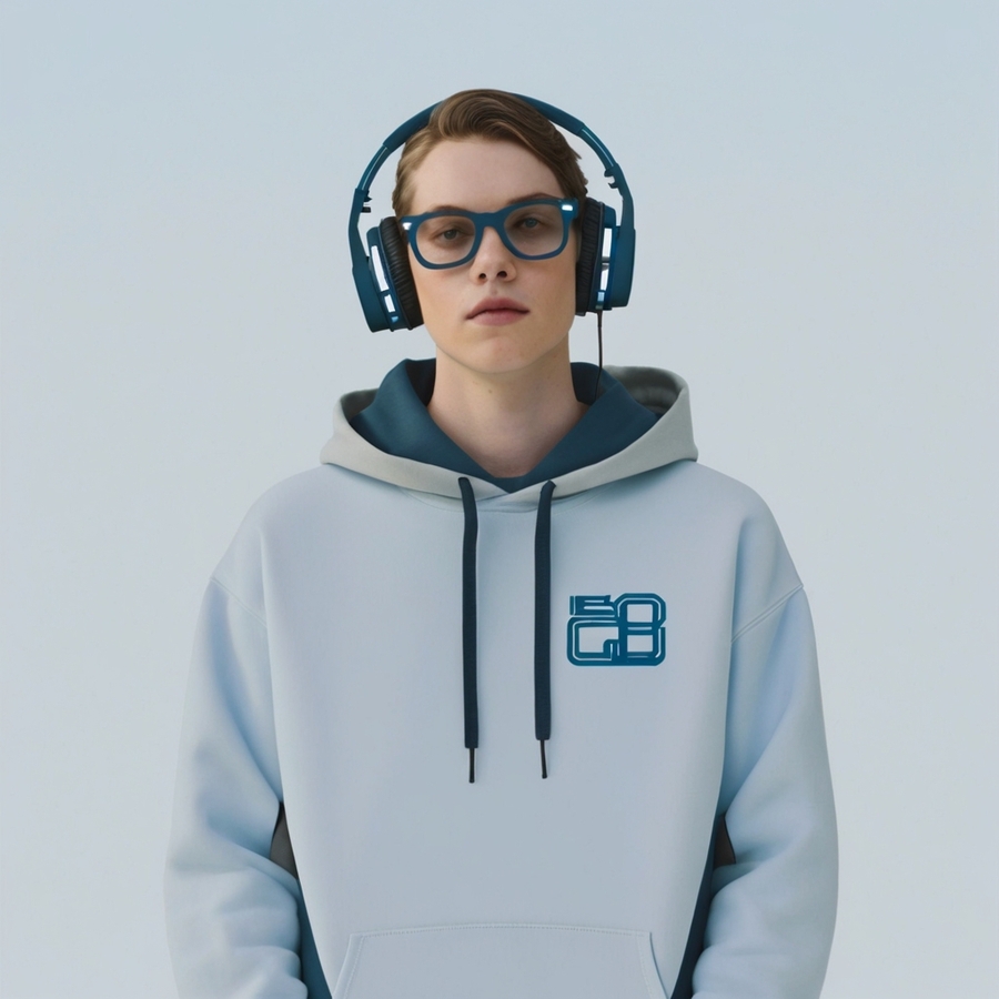 Худи 1: leonardo.ai (A fashion photograph featuring a standing fullbody model wearing headphones and a large, oversized hoodie. The hoodie is adorned with a modern art picture for the DIGITAL HAVEN computer club. The background is light. The overall atmosphere of the photo is modern and technical.) (Leonardo Kino XL; Cinematic))