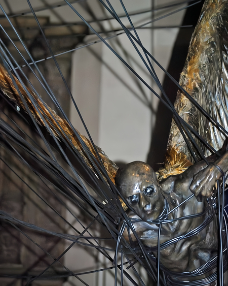 Machines perform tasks without question, like angels carrying out divine orders. Fryer’s Morning Star — its title echoing the Latin «light-bringer», the name Lucifer originally used for the planet Venus before it became linked to the fallen angel — captures this paradox: a golden angel, captured in wires, embodying both obedience and rebellion.The sculpture reminds to the viewer that execution of commands can be powerful, even worshipful, when viewed culturally.