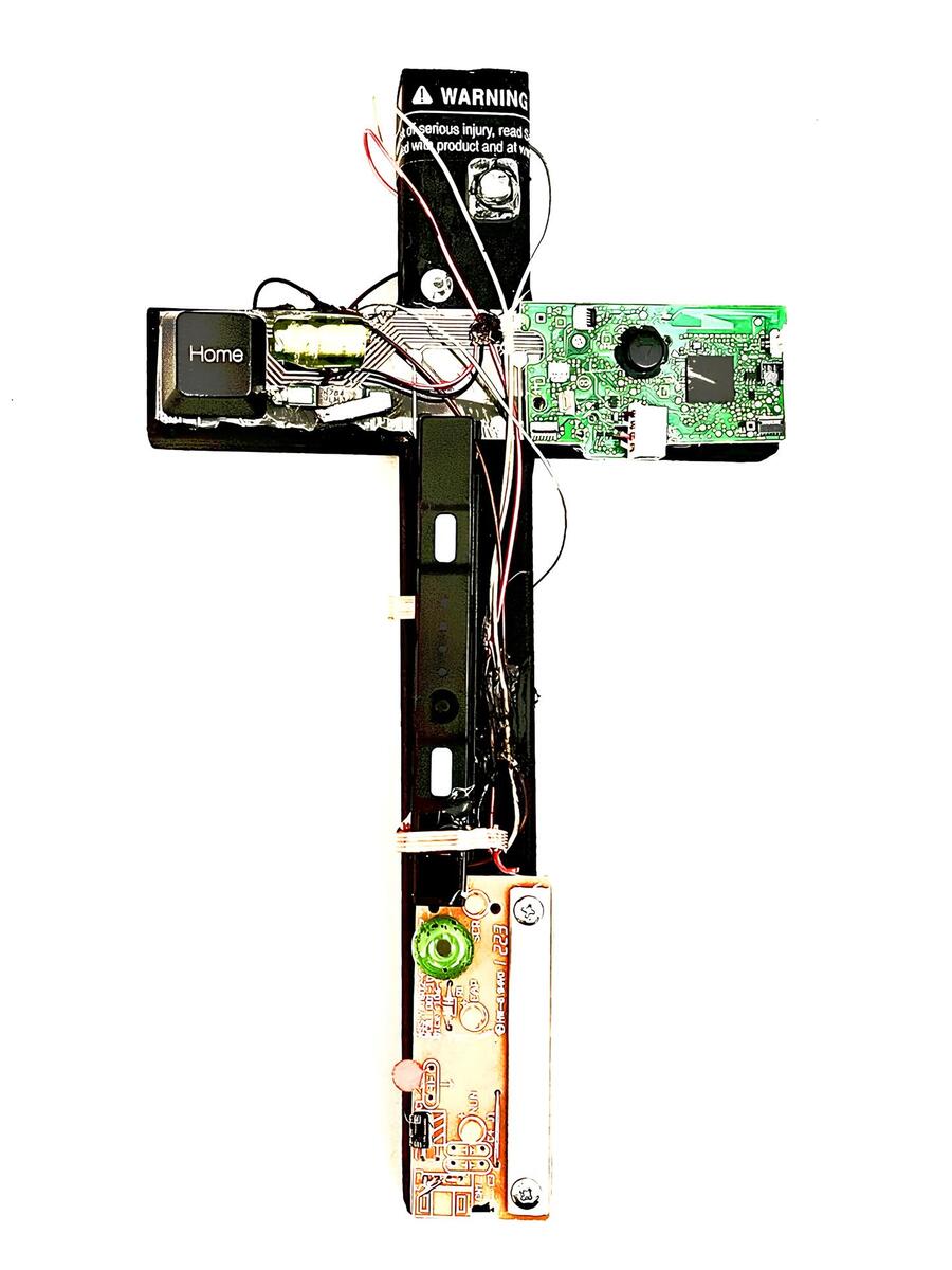 Stane Jagodič’s assemblage Contemporary Golgotha (1999) shows how fragile technological memory can be. Computer motherboards, detritus and sacrificial forms compose a modern crucifixion. The assemblage presents technological memory as both saving and frail — religious form is reconstituted with electronic carcasses, insisting that today’s archive is built on things already becoming outdated.