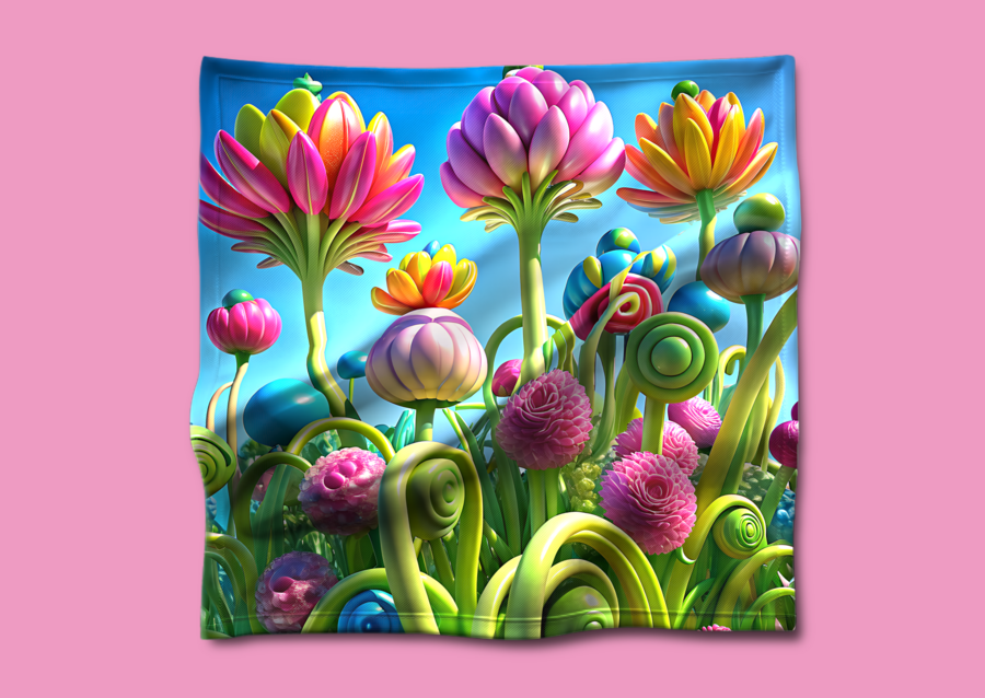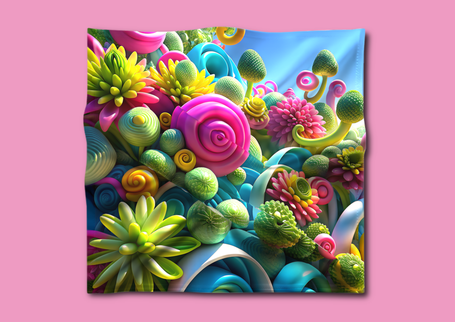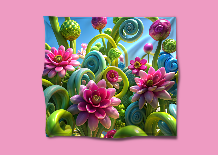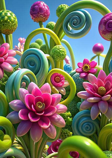 Промт: generate an abstract pattern, curly flowers and plants pattern, sky at the background, glossy textures, 3D render, bright lighting, high resolution